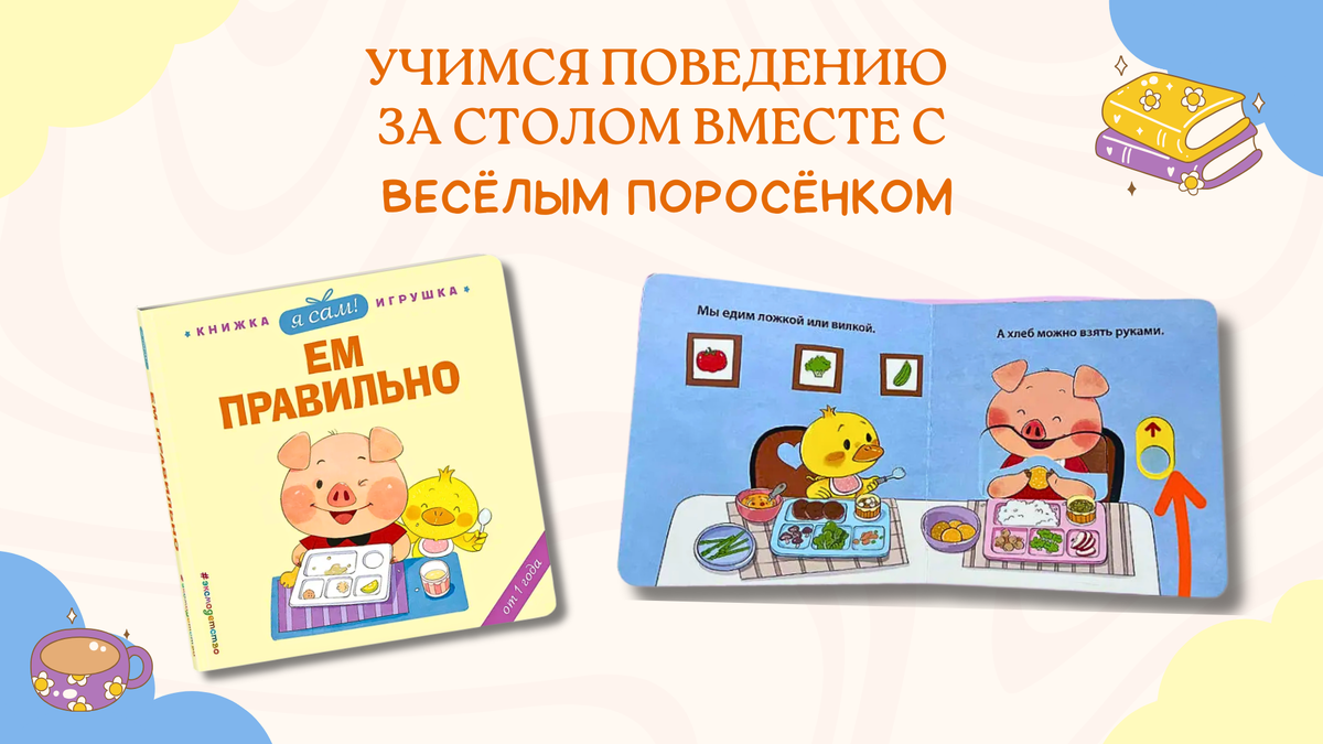 Знакомы ли вам ежедневные «битвы» за чистые зубы, горы нежелания убирать игрушки и уговоры сесть за стол? Воспитание малыша — это любовь, терпение и… хитрость. Самый эффективный способ привить полезные привычки — не заставлять, а увлекать. И именно для этого созданы интерактивные книги-игрушки. Это настоящее приключение, где на каждой странице малыша ждут сюрпризы: окошки, которые можно открыть, крутящиеся колёсики и подвижные ползунки. Пока маленькие пальчики тренируют моторику, ум с лёгкостью усваивает важные правила. Мы выбрали четыре книги из серии «Веселые деньки. Книги-игрушки о полезных привычках для малышей», чтобы наглядно показать, как они помогают решать самые частые родительские «задачи». «Я сам! Ем правильно» Проблема: Ребёнок отказывается от полезной еды, вертится, разбрасывает еду. Решение: Весёлый Поросёнок станет лучшим другом за завтраком. Эта книга — мягкий и понятный гид по этикету и здоровому питанию для самых маленьких. Вместо скучных нотаций — игровые элементы,