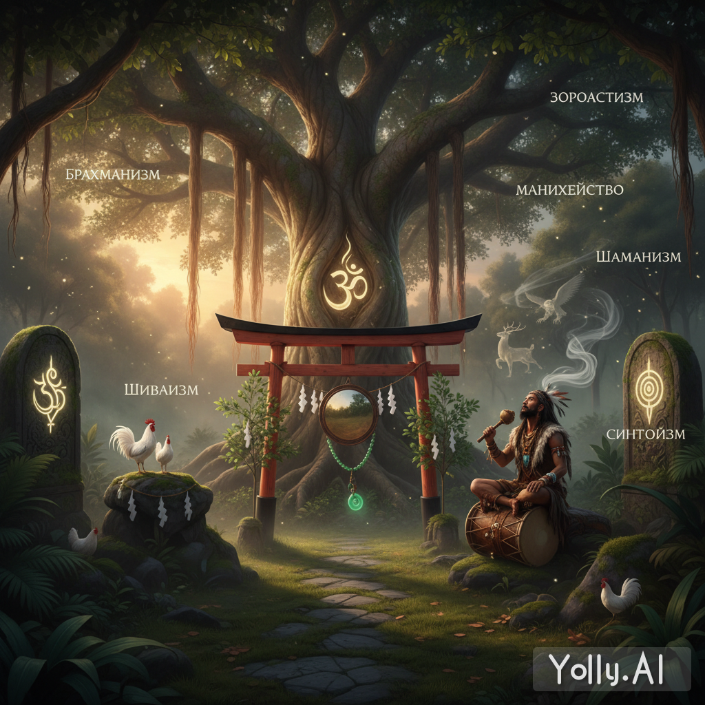 ШАМАНИЗМ (МНОГОБОЖИЕ) – ранняя форма религии, в основании которой лежит вера в общение шамана с духами в состоянии транса («камлание»). Шаманизм связан с магией, анимизмом, фетишизмом и тотемизмом. Его элементы могут содержаться в различных религиозных системах. Шаманизм был развит у народов Северной Европы (саамы), Сибири, Дальнего Востока, Юго-Восточной и Средней Азии и Африки, у индейцев Северной Америки, Австралии и Океании, а также и у индейцев Южной Америки. В той или иной форме он существовал у большинства народов Земли. В этом смысле шаманизм принято считать древнейшей религией, насчитывающей десятки тысячелетий. Однако такое понимание несколько условно, поскольку современные религии предполагают единую мифологическую основу. В шаманизме же мифологическая основа даже в пределах Евразии может отличаться достаточно сильно, а африканский и американский шаманизмы вообще опираются на собственные системы мифов.
