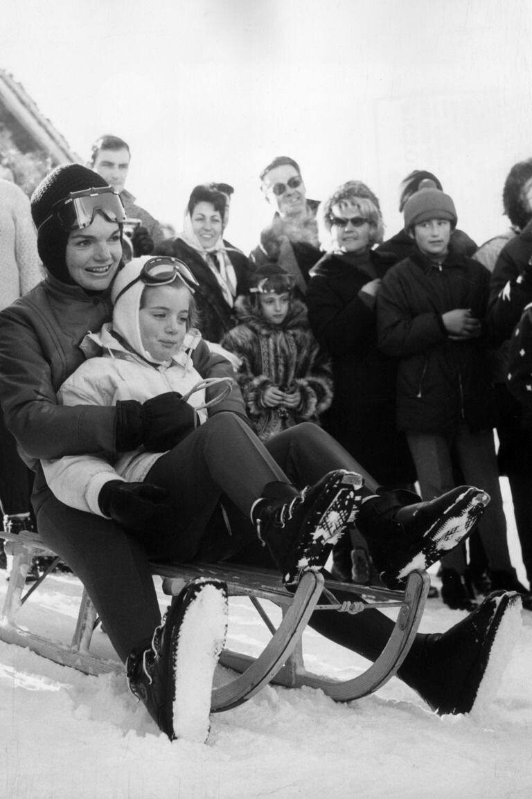Жаклин Кеннеди с детьми на зимнем отдыхе в горах, 1965 год