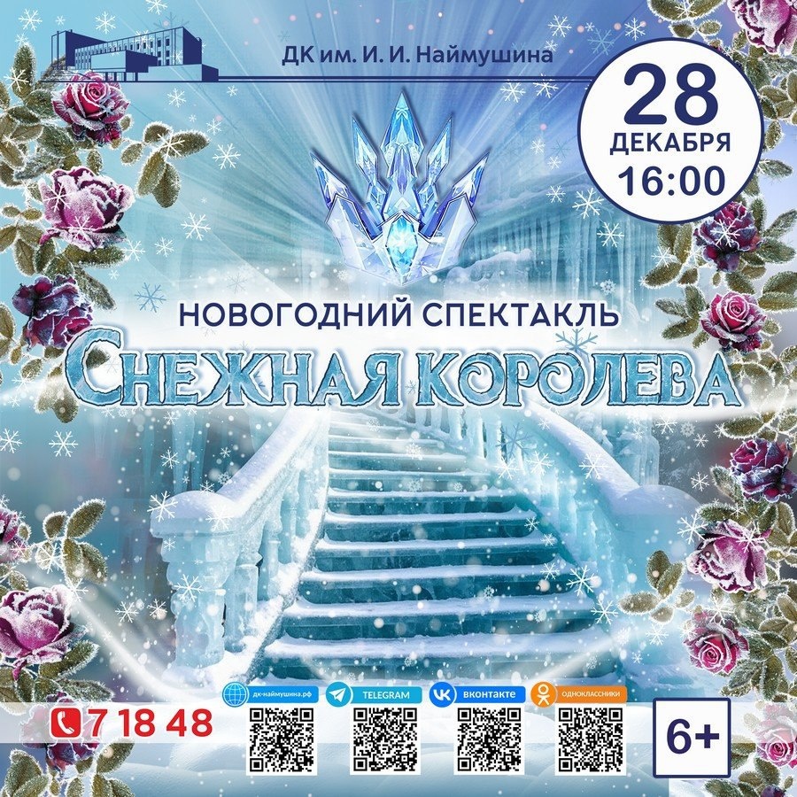 В декабре любимая сказка вновь станет явью. Драматическая история противостояния смелой девочки Герды, её названного брата Кая и повелительницы холода Снежной королевы оживет на сцене Дворца культуры им. И.И. Наймушина! Старые истины о преодолении препятствий и преград во имя спасения дорогого человека. История о дружбе, любви и вере. Музыка, которая уносит в детство. История, которая напоминает о главном. Подарите себе и своему ребенку, путешествие в новогоднюю сказку. 🗓️28 декабря, 16:00 Билеты в кассе ДК и на сайте https://center-kino.ru/221/release/10065602 Справки по тел.: 8 (39535) 7-02-32 0+