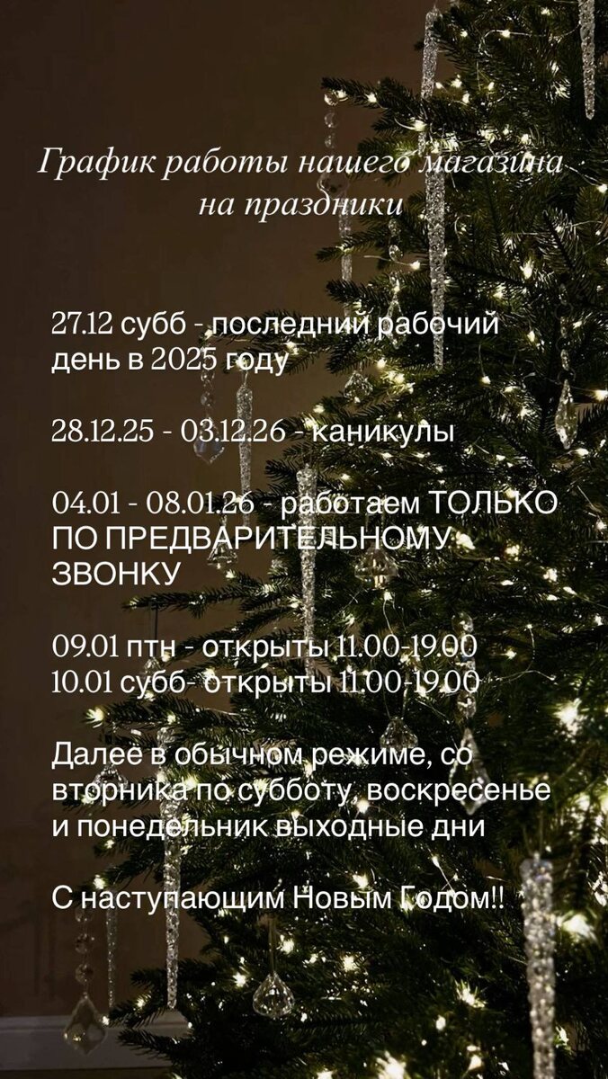 27.12 субб - последний рабочий день в этом году 28.12.25 - 03.01.26 - новогодние каникулы 🎄 04.01 - 08.01.26 - работаем ТОЛЬКО ПО ПРЕДВАРИТЕЛЬНОМУ ЗВОНКУ, т.89139153366, 89139431661☎️ 09.01 птн - открыты 11.00-19.00 10.01 суб - открыты 11.00-19.00 Далее в обычном режиме со вторника по субботу, выходные воскресенье и понедельник✂️ С наступающим Новым Годом!!🥂🍾 Каталог наших тканей можно пролистать на сайте http://evro-tkani.ru 🛒 и там же заказать 👥Наша страница в ВК https://vk.com/evro_tkani154 🏢Наш канал в Дзен: https://dzen.ru/tkani_italia54_t Ответим на все вопросы в Диалоге магазина @evro_tkani54 🔗