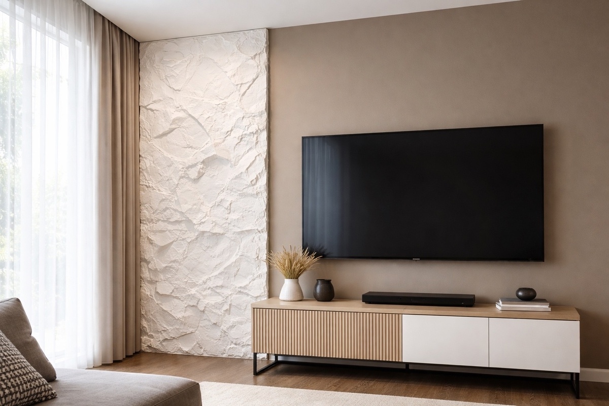 Знакомая ситуация: хочется, чтобы стена за телевизором выглядела дорого и стильно, но на масштабный ремонт нет ни средств, ни времени. Обои и покраска уже не впечатляют — они плоские, быстро надоедают и не дают того самого интерьерного «вау».
