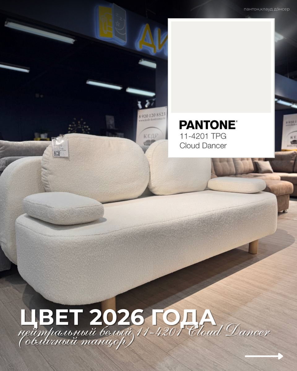 • подходит для долгосрочных интерьеров без привязки к быстротечным трендам Cloud Dancer (Клауд Дэ́нсер) особенно хорошо раскрывается в мебели: он не «съедает» объём, не выглядит плоско и позволяет материалам — ткани, древесине, шпону, камню — выглядеть глубже и дороже. Практически: