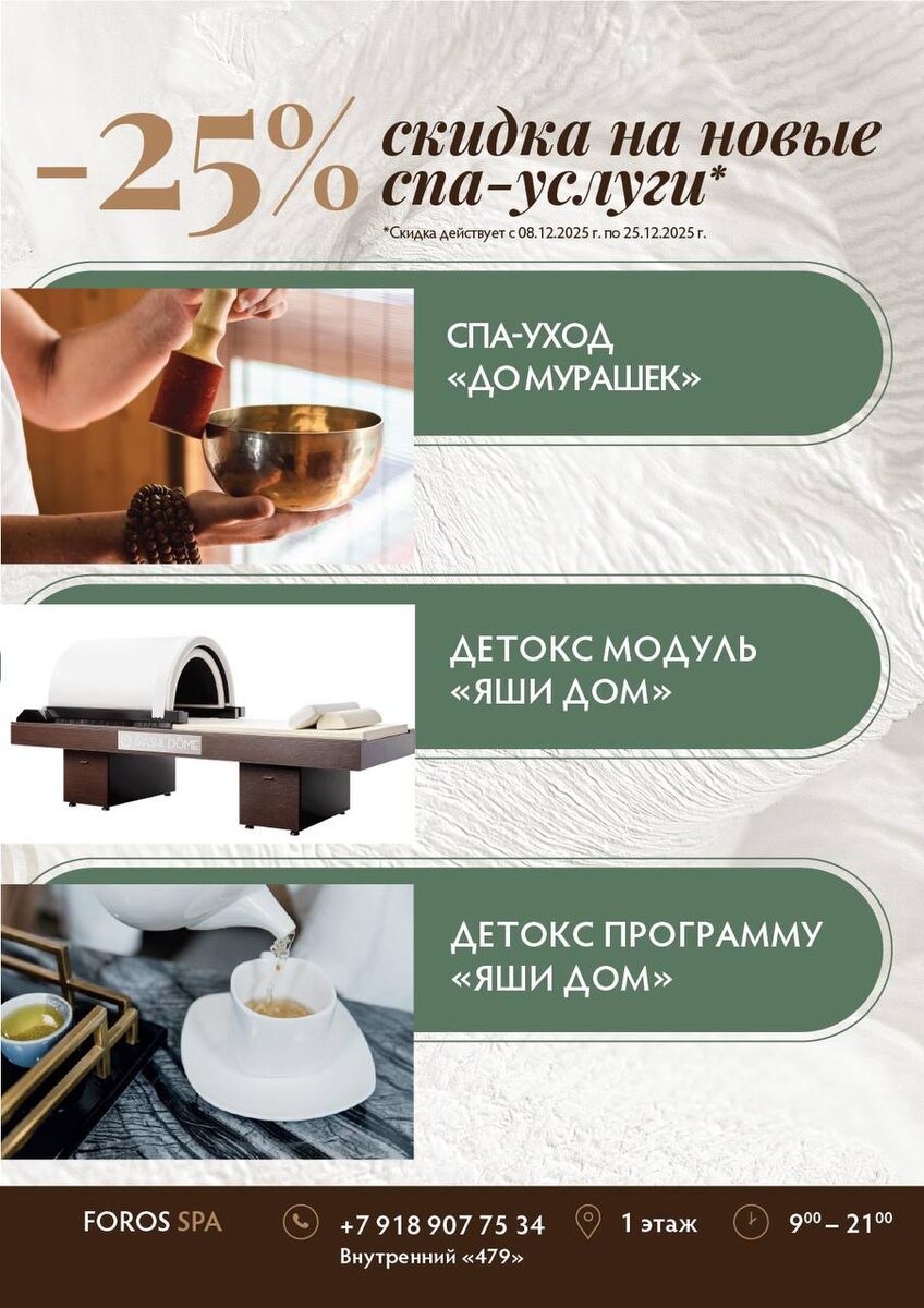 🔥–25% на новые SPA-услуги в FOROS SPA Подарите себе глубокое расслабление и перезагрузку с новыми акционными предложениями! 🌿 В акции участвуют: • SPA-уход «До мурашек» Мощное расслабление, восстановление баланса и полное погружение в состояние покоя. • Детокс-модуль «Яши Дом» Инновационный подход к очищению и восстановлению организма. • Детокс-программа «Яши Дом» Комплексное обновление тела и энергии. 📅 Акция действует с 08.12.2025 по 25.12.2025 📍 FOROS SPA, 1 этаж 🕘 ежедневно с 9:00 до 21:00 📞 Запись и подробности: +7 (918) 907-75-34, внутренний «479» ❤️Позвольте себе больше, чем просто отдых!