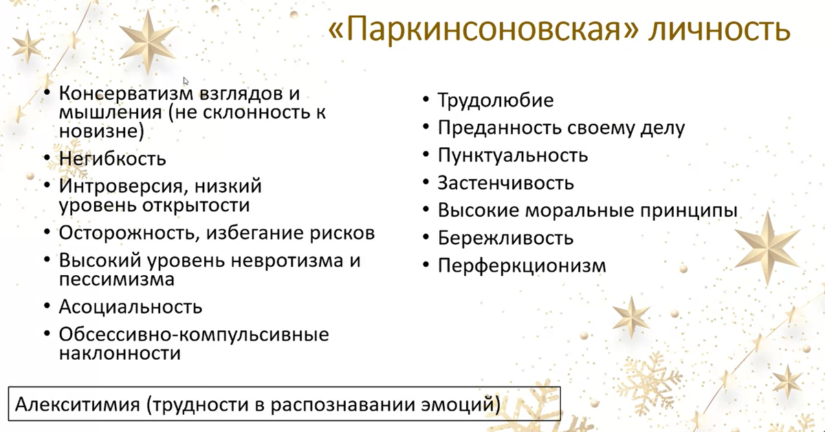 Болезнь Паркинсона часто ассоциируется только с двигательными нарушениями: тремором, скованностью. Но это лишь верхушка айсберга. Гораздо больше на качество жизни влияют изменения в психике и поведении. О них, а также о том, как лечение может как помочь, так и осложнить ситуацию, мы поговорили с неврологом-паркинсонологом, руководителем центра в Оренбурге, Татьяной Александровной Кутниковой. Татьяна Александровна, с чего начинаются изменения в психике при болезни Паркинсона? Есть ли особый «паркинсонический» тип личности? «Больше ста лет назад врачи стали отмечать определенные черты личности, характерные для человека с болезнью Паркинсона. Эти изменения появляются еще до первых двигательных симптомов. Что же это за черты? Это определенный консерватизм взглядов, отсутствие гибкости в мышлении, не склонность к новизне. Это осторожность, высокий уровень невротизма, пессимизм. Но также это люди трудолюбивые, с высокими моральными принципами, пунктуальные, верные своему делу, часто достига