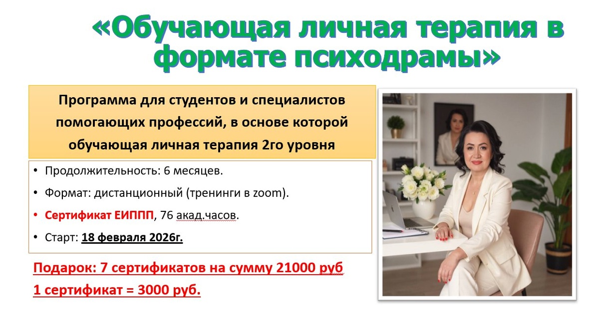 7 сертификатов на общую сумму 21.000 руб разыграем на программу "ОБУЧАЮЩАЯ ЛИЧНАЯ ТЕРАПИЯ В ФОРМАТЕ ПСИХОДРАМЫ". Тренер: Коляева Марина Владимировна. Подробнее: https://eippp.ru/educational_personal_therapy