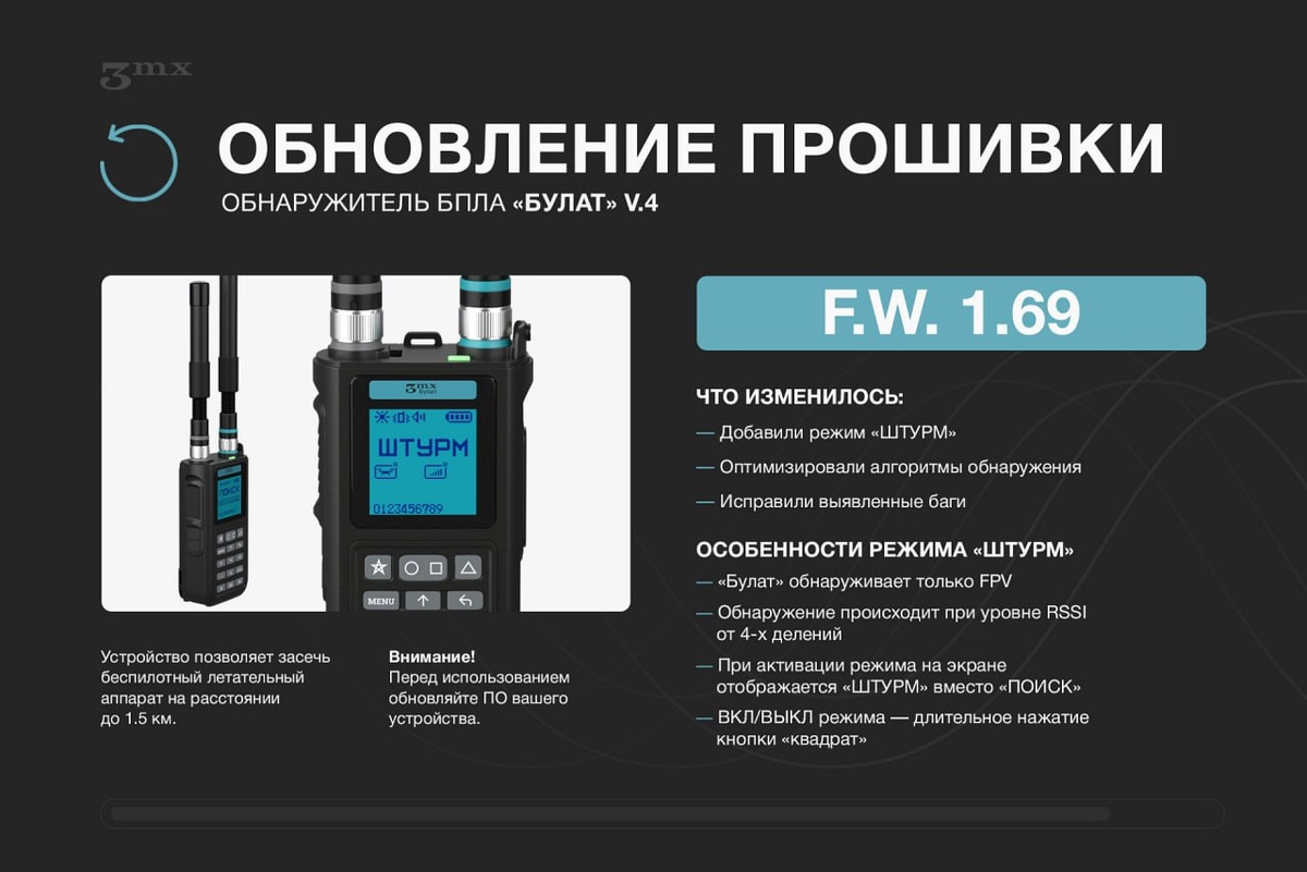 Текущая версия прошивки: f.w. 1.69 Что изменилось: • Реализован новый режим «ШТУРМ» • Улучшены алгоритмы обнаружения • Исправлены выявленные ошибки и неточности в работе ПО ℹ️ Ключевые особенности режима «ШТУРМ»: • Детекция осуществляется исключительно по FPV-дронам • Обнаружение начинается при уровне сигнала RSSI от 4 делений • После активации режима на дисплее отображается надпись «ШТУРМ» вместо стандартного «ПОИСК» • Включение и отключение режима — долгим нажатием кнопки «квадрат». Заказать детектор дронов Булат V4 вы можете у нас 👇 Наш сайт: https://alkortactical.ru/ ПОЛНЫЙ КАТАЛОГ: https://t.me/addlist/eJlIjSrCnVc5MmEy Телеграм: t.me/AlkorTactic Тел: +74951821731 Почта: alkortactical@rus-family.ru Москва, ул. Перовская д.1, 6 этаж. Режим работы: Пн-Сб с 9:00 до 18:00 Для срочной связи пишите или звоните по телефону: +79776241681