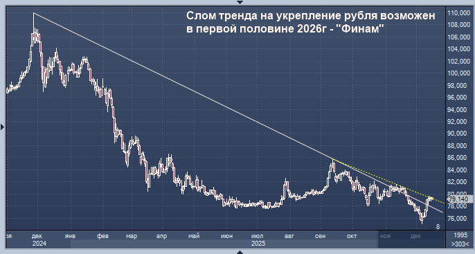 Слом тренда на укрепление рубля возможен в первой половине 2026г - "Финам" Курс доллара к рублю расчётный, фьючерс, вечный фьючерс и межбанк. Курс евро к рублю расчётный, фьючерс, вечный фьючерс и межбанк. Курс юаня к рублю биржевой, фьючерс, вечный фьючерс и межбанк. Слом тренда на укрепление рубля возможен в первой половине 2026 года, говорится в материале аналитика "Финама" Александра Потавина. "В 2025 году рубль оказался существенно крепче, чем ранее прогнозировалось, - отмечает эксперт. - Пара USD/RUB к середине декабря показывает снижение на 27,5%, что стало возможным за счет целого набора факторов: повышенных ставок по рублям, высоких объемов продажи валюты из резервов со стороны ЦБ, росту объемов расчетов в рублях за экспорт и импорт, повышенных объемов продажи валюты экспортерами, притоку денег со счетом зарубежных банков во внутренний контур от физлиц, а также закрытию большинства каналов по выводу валюты за рубеж". По мнению Потавина, в декабре курс доллара может быть вполне