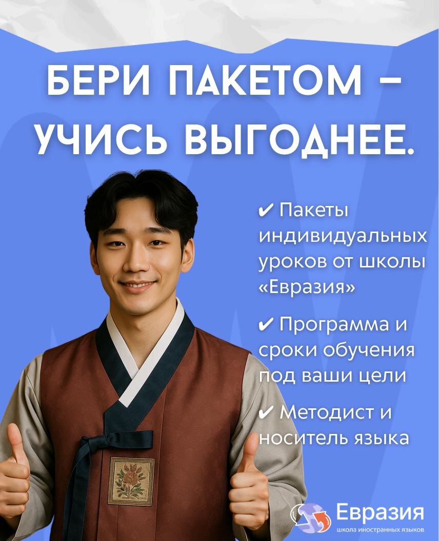 Школа иностранных языков «Евразия» делает изучение корейского ещё более выгодным — всё продумано под ваши цели и график. 📍 Форматы обучения — Пакеты по 32 или 64 урока — Продолжительность занятий 60 или 90 минут — Преподаватель на выбор: русскоязычный педагог, носитель или их комбинация 💵 Экономия до 700 ₽ на одном занятии! ⭐️ Что входит в пакет ➡️ Продуманный срок обучения — удобно планировать и видеть реальный прогресс. ➡️ Консультации с методистом-наставником — помогает закреплять результат. ➡️ Бесплатный доступ в разговорный клуб. ➡️ Возможность заморозки занятий — если уезжаете или нужен перерыв. Дарим подарки к началу зимы — ловите свежую акцию! 🎁 +1 месяц индивидуалки бесплатно Берёшь пакет занятий — получаешь ещё 4 недели уроков без доплат. 📩 Пиши слово КОРЕЯ менеджеру 👉 @Eurasia_online_help_bot и сделай первый шаг навстречу языку уже сегодня!