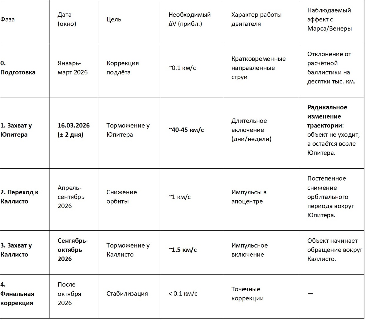 ДЕТАЛЬНЫЙ ПОШАГОВЫЙ СЦЕНАРИЙ МАНЁВРА ДЛЯ ВЫХОДА 3I/ATLAS НА ОРБИТУ КАЛЛИСТО С УЧЁТОМ ЕГО ГРАВИТАЦИИ, ПРЕДПОЛАГАЕМЫХ ХАРАКТЕРИСТИК «ДВИГАТЕЛЯ» И ВРЕМЕННЫ́Х ОКОН