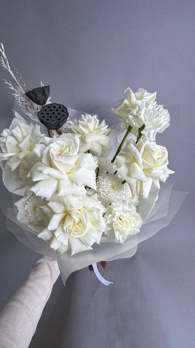 ? Это белоснежная композиция, в которой нет ничего лишнего: ⚜️ Французские розы сияют холодной белизной, словно только что тронутые морозом. ❄️ Туя добавляет серебристый акцент — как тонкие ледяные узоры на стекле. 🧊 А коробочки лотоса фиксируют мгновение, напоминая: истинная роскошь — в спокойствии и чистоте формы. Цена 6490.- 📩 Напишите нам в личные сообщения @Glow_Flowers, пока эта зимняя сказка ещё в наличии