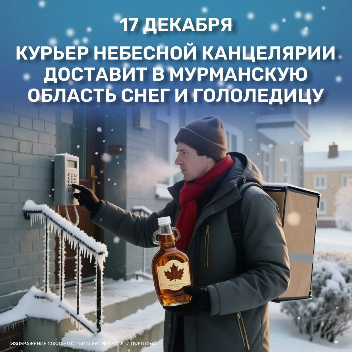 В отдельных районах туман Местами будет идти небольшой снег. Ветер юго-западный, южный умеренный. Температура воздуха ночью от -5 до -10 градусов Цельсия, при прояснениях -13…-18, днем -1…-6, местами до -11. Гололедица. 📦 17 декабря - День курьера. Отличный повод сказать большое спасибо тем, кто привозит нам пиццу, когда на улице метель, и продукты, когда просто лень выходить из дома. Пусть в ваших заказах будет меньше пятилитровых бутылок с водой, а в карманах - больше чаевых! 🍁 А еще 17 декабря - День кленового сиропа. Кстати, для его приготовления используют только сахарные виды кленов, а возраст дерева должен быть больше 40 лет. Чтобы получить один литр продукта, требуется около 40 литров кленового сока.