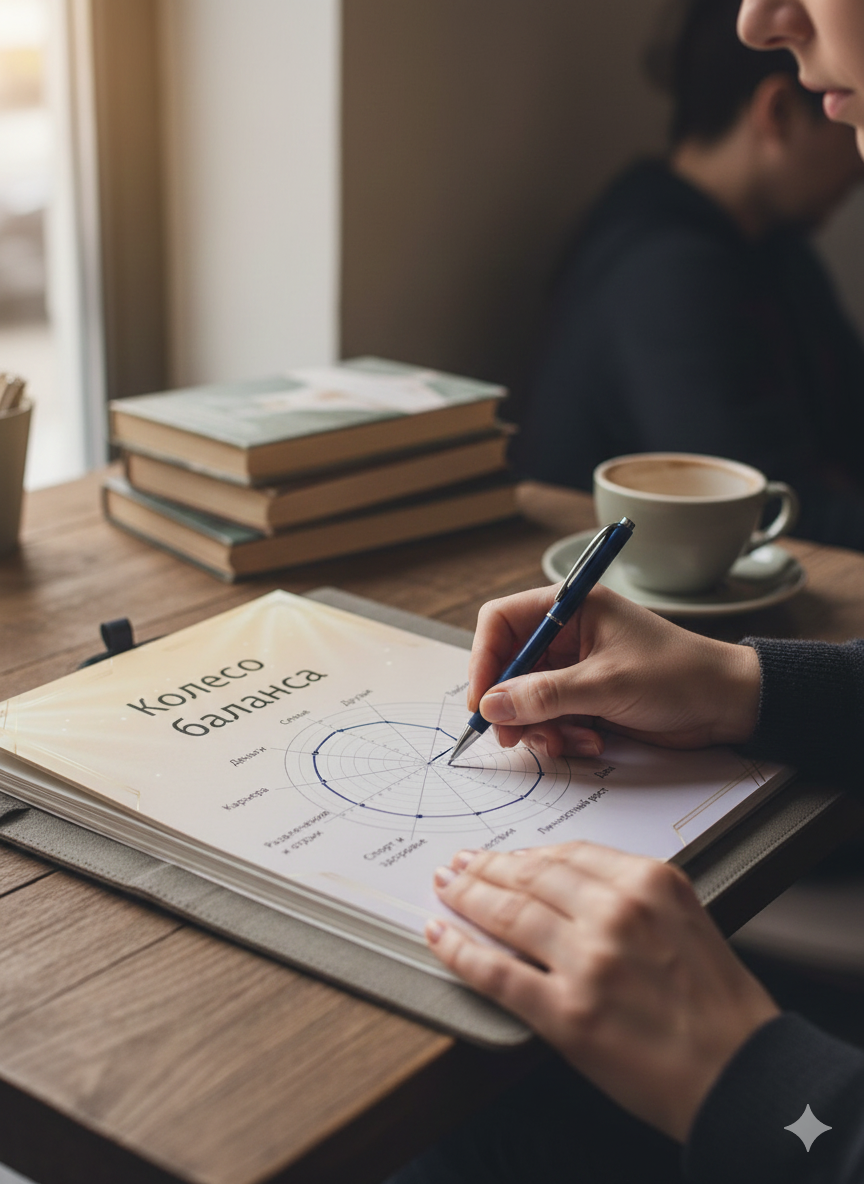 Это ваш личный «снимок счастья». Вы оцениваете от 1 до 10 не работу, а 8-10 ключевых сфер: Карьера, Финансы, Здоровье, Отдых, Творчество, Отношения, Личный рост, Окружение.