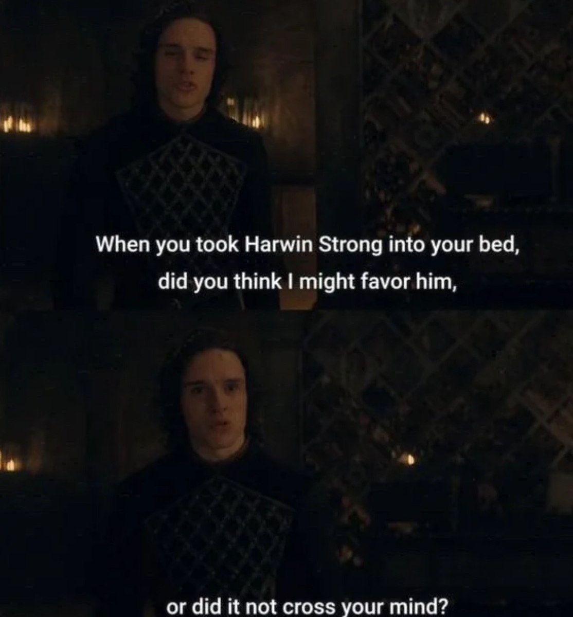 Рейнира — НАСЛЕДНИЦА, поэтому на ней были обязанности, особенно в том, чтобы обеспечить законность королевской династии. Это буквально главная задача любой королевской пары, потому что это поддерживает мир и предотвращает споры о престолонаследии. Она не просто сделала личный выбор, она поставила под угрозу всё королевство. Выставляя напоказ свой роман с Харвином и имея очевидных бастардов, она ясно дала понять, что её дети не от Ленора. Это не просто личный проступок, это ещё и политическая глупость.