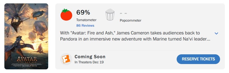 «Аватар: Пламя и пепел» получил самые низкие оценки в серии — 69% на Rotten Tomatoes