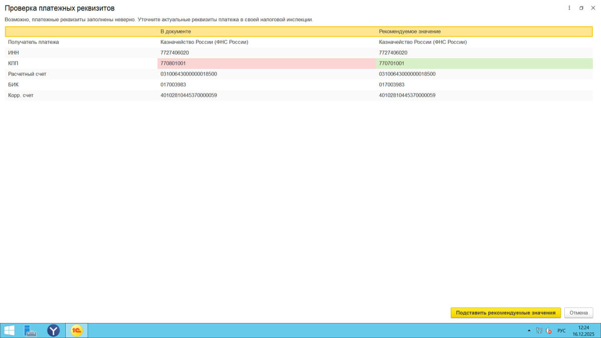 05 декабря 2025 года ФНС России (получатель) сообщила об изменениях реквизитов для уплаты налогов, сборов, страховых взносов на ЕНС. В реквизите платёжного поручения «КПП получателя» необходимо указывать новый код 770701001. Было КПП 770801001 стало КПП 770701001 При этом остальные реквизиты получателя остались прежними. До 12.12.2025 предусмотрен переходный период, когда будет производиться перекодировка реквизита. Поэтому указание старого КПП в переходный период не повлияет на зачисление денежных средств в бюджет. Смена КПП связана с переездом Межрегиональной инспекции ФНС России по управлению долгом на новый юридический адрес. 16.12.2025 г.