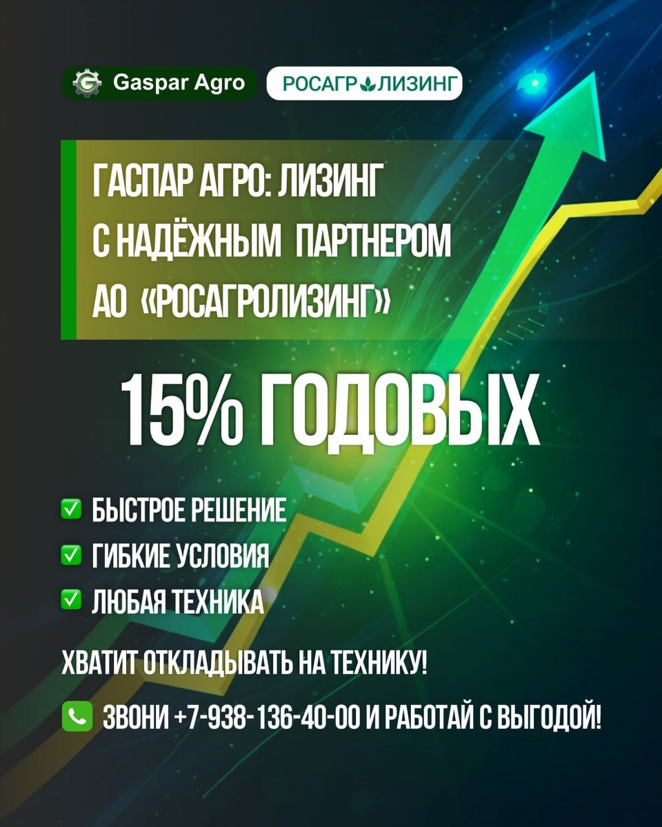 15% на технику от «Гаспар Агро» с «Росагролизинг»! Устарела техника? Ремонты съедают бюджет? Не копите на новый агрегат сезонами — есть решение! ✅ Лизинг спецтехники под 15% годовых Плёнкоукладчики, грядообразователи, пленкосборщики — уже в этом сезоне! Ваши преимущества: 🌱Первый взнос от 0% 🌱Работа с «Росагролизинг» — надёжно и прозрачно 🌱Решение за 1 день, минимум документов 🌱Полное сопровождение сделки Обновите парк с выгодой! 👉 Рассчитайте ваш платёж: Пишите «ЛИЗИНГ» в сообщения или звоните: +7 (938) 136-40-00 #ГаспарАгро #Росагролизинг #ЛизингТехники #Сельхозтехника #Агробизнес #ЛизингДляСХ