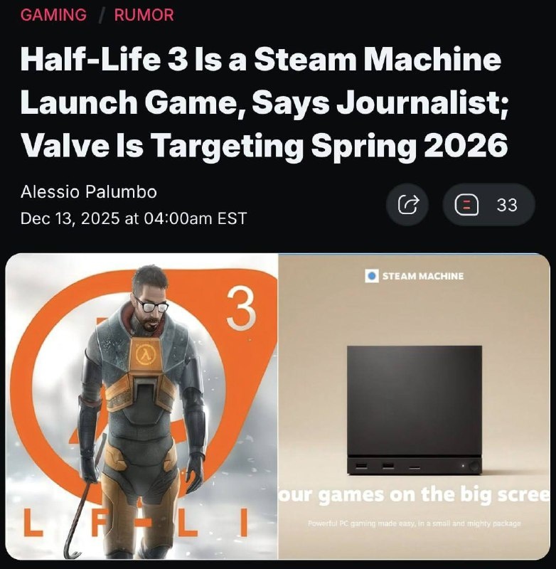 😅 Half-Life 3 не выходит из-за ИИ Журналисты рассказали, что на релиз и анонс игры напрямую повлиял коллапс на рынке DDR-памяти. По порядку: • Half-Life 3 должна выйти вместе со Steam Machine, но из-за роста цен на память Valve не могут выставить ценник на консоль. ИИ-пузырь разбивает ВСЕ планы Габена. • Если раньше Valve хотели выкатить консоль в первом квартале 2026 года, то сейчас старт продаж уехал на март-июнь. В конце концов главное — Half-Life 3 существует. Здесь нет никаких сомнений. Главный вопрос когда [она выйдет], — пишут инсайдеры. 🧠TechObserve