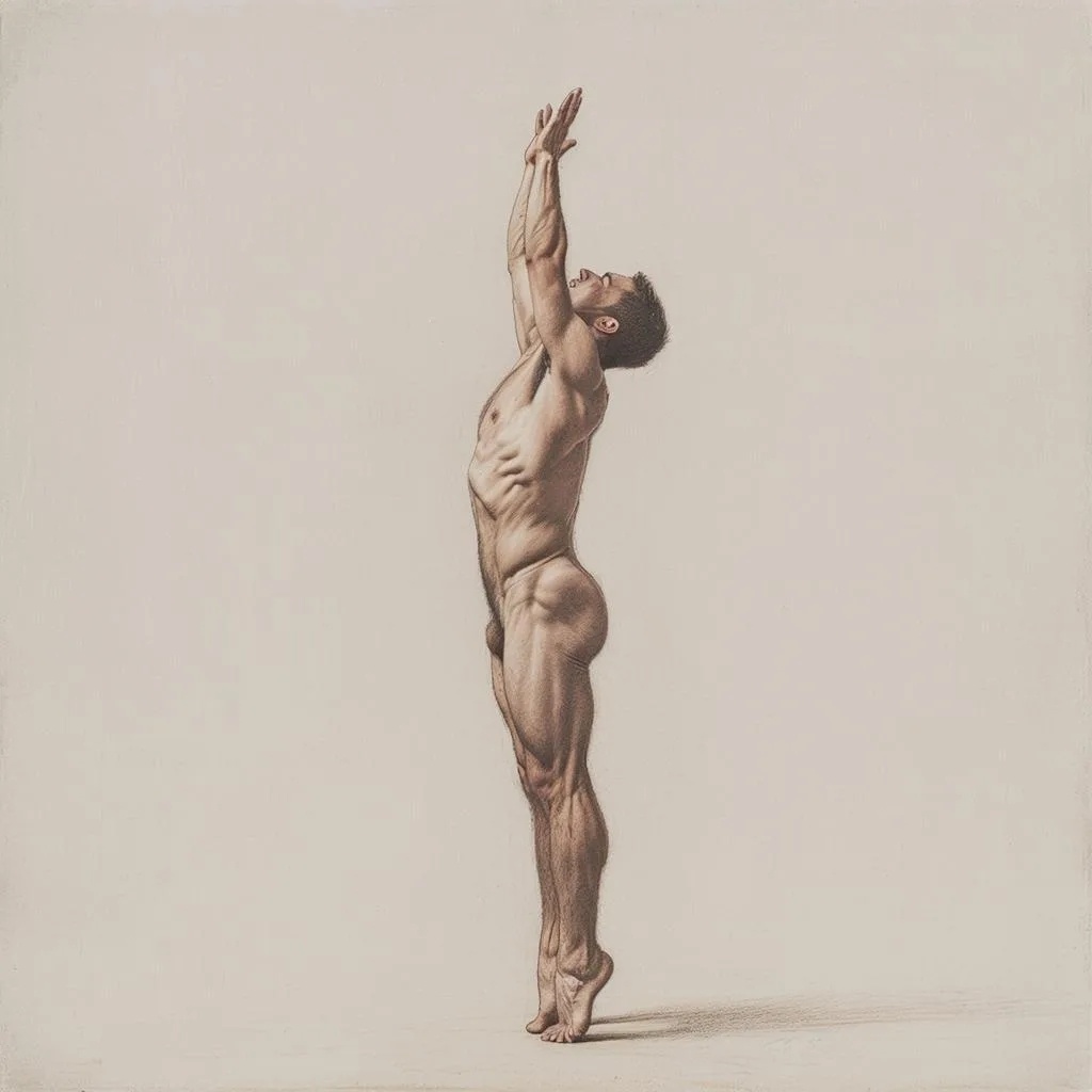 Представьте: вы — как молодое дерево после дождя. Ваши сцепленные руки — это ствол, тянущийся к солнцу. Стопы на цыпочках — нежные корни, впитывающие силу земли. Ваш живот — почва, где под лучами дыхания и тепла движения начинается таинство превращения пищи в чистую энергию. Вы не стоите — вы растёте, а ваше пищеварение становится частью этого природного, легкого потока.