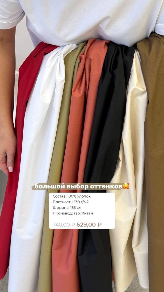 Начинаем обзор скидок с хлопка поплин🥰 Состав: 100% хлопок Плотность: 130 г/м2 Ширина: 155 см Производство: Китай 🛍 740,00 ₽ 629,00 ₽ Классическая хлопковая ткань с тонким переплетением нитей, создающая мягкую, гладкую поверхность с легким благородным блеском. Благодаря натуральному составу обладает высокой воздухопроницаемостью и гипоаллергенными свойствами, обеспечивая комфорт в носке. ✔️ Текстура: гладкая, с характерным мелким рубчиком Для чего подходит? ▫️Классические и повседневные рубашки ▫️Летние платья и сарафаны ▫️Детская одежда ▫️Легкие блузы и офисная одежда