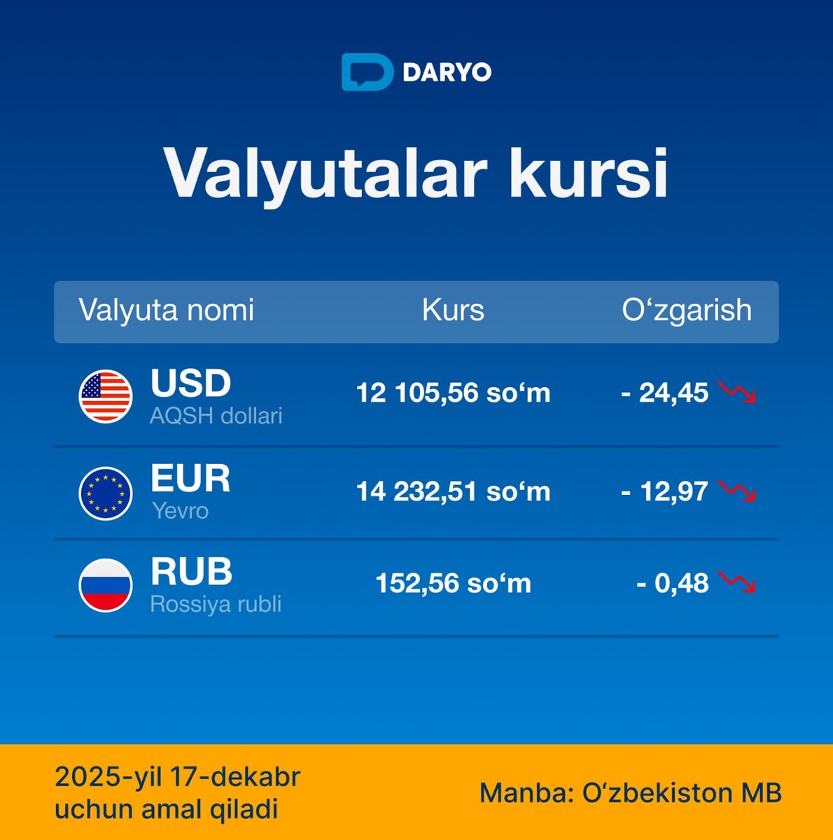 O‘zbekistonda 4-dekabrdan beri tushmay kelayotgan dollar kursi pastladi 🇺🇸 dollar 12 105,56 soʻm (-24,45) 🇪🇺 yevro 14 232,51 soʻm (-12,97) 🇷🇺 rubl 152,56 soʻm (-0,48) @daryolive