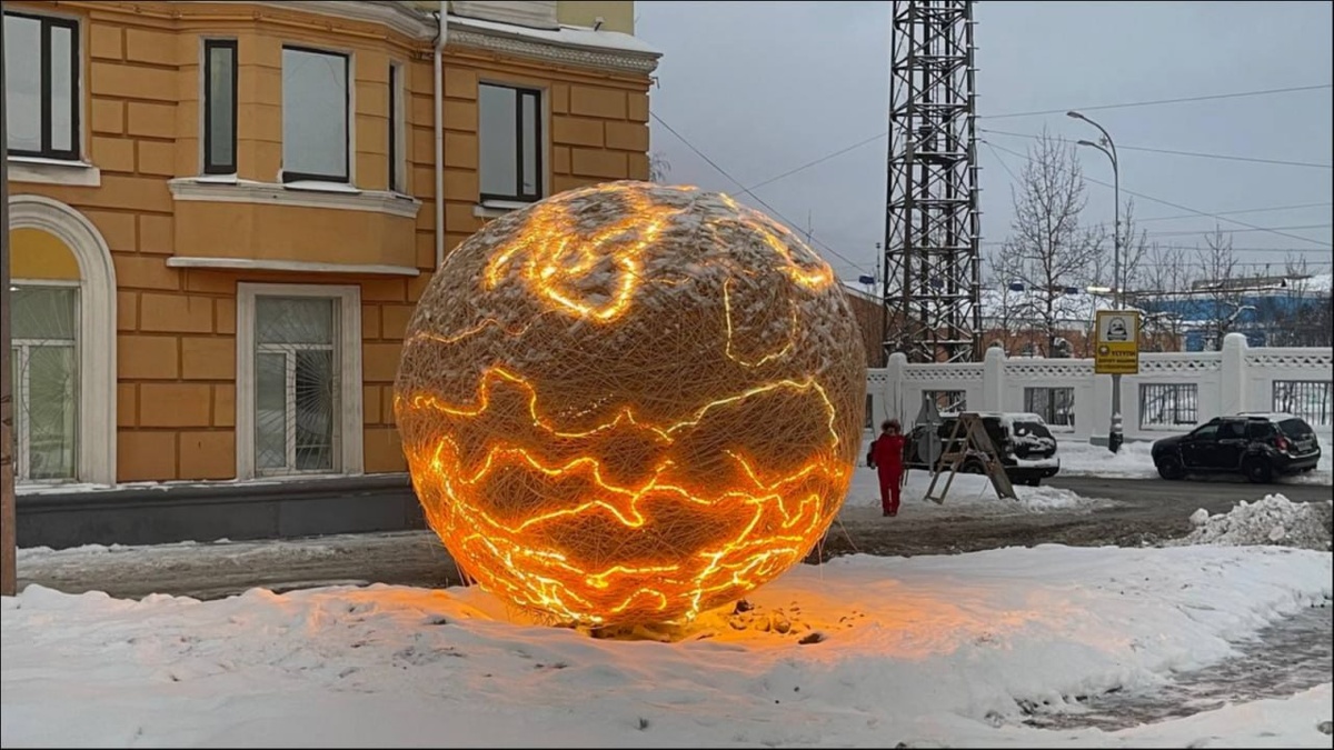 Это светящийся шар, внутри которого около 15 тысяч прутьев ивы (их собирали по всей России последние 1,5 месяца) и 150 светодиодных линий, компьютер и датчики.