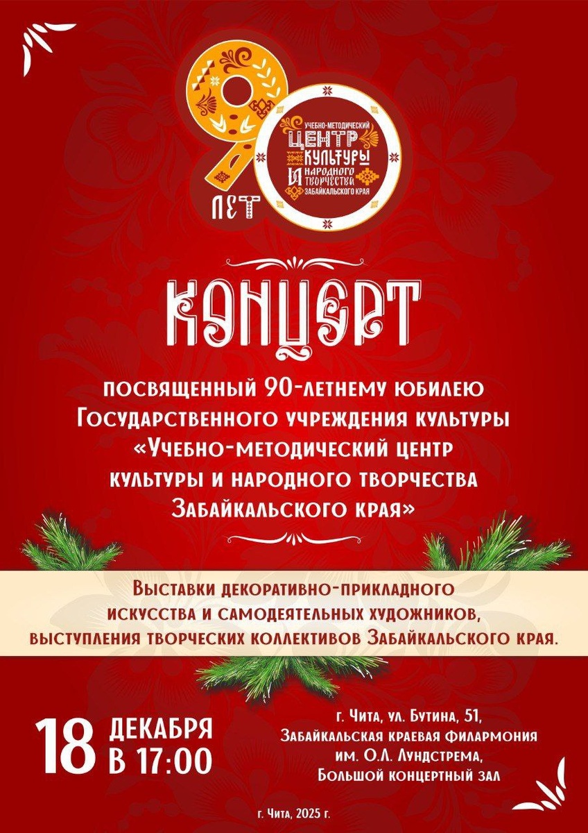 18 декабря 2025 г. в Забайкальской краевой филармонии имени О.Л. Лундстрема пройдет юбилейный концерт, посвящённый 90-летию Учебно-методического центра культуры и народного творчества Забайкальского края. В этот вечер вы сможете насладиться выступлениями лучших творческих коллективов и солистов Забайкальского края, окунуться в атмосферу театрального мастерства, народных традиций и искусства родного края. Концерт обещает стать настоящим праздником души и сердца, наполненным теплом сибирских просторов и искренностью исполнения артистов, чьи голоса и мастерство подарят вам незабываемые впечатления! 📍Вход по пригласительным билетам.