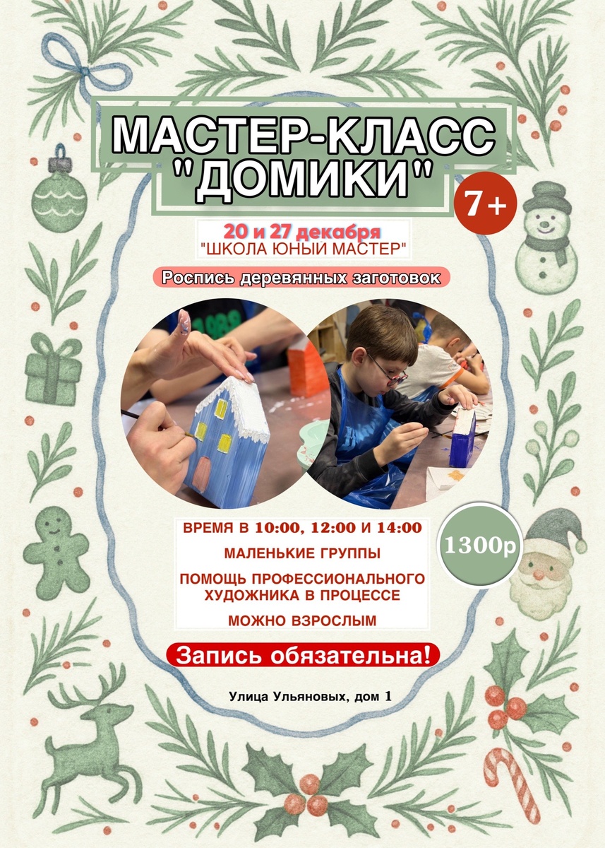 ✨ Запись на мастер-класс по рисованию «ДОМИКИ»💫 Приглашаем вас и ваших детей погрузиться в увлекательный мир творчества и наполнится предновогодней атмосферой 🍭🚗🎄 🎨Что будет: разукрасим деревянную домик-заготовку как пожелаете. А далее, покроем лаком, высушим и можно будет забрать домой. ❗Количество мест ограничено, запись обязательна 🗓 20 и 27 декабря (субботы) три группы: 10:00 - 10 мест 12:00 - 10 мест 14:00 - 10 мест 🕚Продолжительность - 1,5 часа Стоимость: 1300 руб. Скидки многодетным и если двое детей из одной семьи - 10% 🫰 Возраст участников 7+, девочкам и взрослым- можно 😉 🏢 Школа ЮНЫЙ МАСТЕР 📍 г. Подольск, ул. Ульяновых, 1 ⭐Поддержать канал голосом 🍰Где поесть в Подольске ✅ Мероприятия Подольск https://dzen.ru/id/66ed500f7b5671493eca3fd6 http://vk.com/podolsk_events http://dzen.ru/podolsk_events