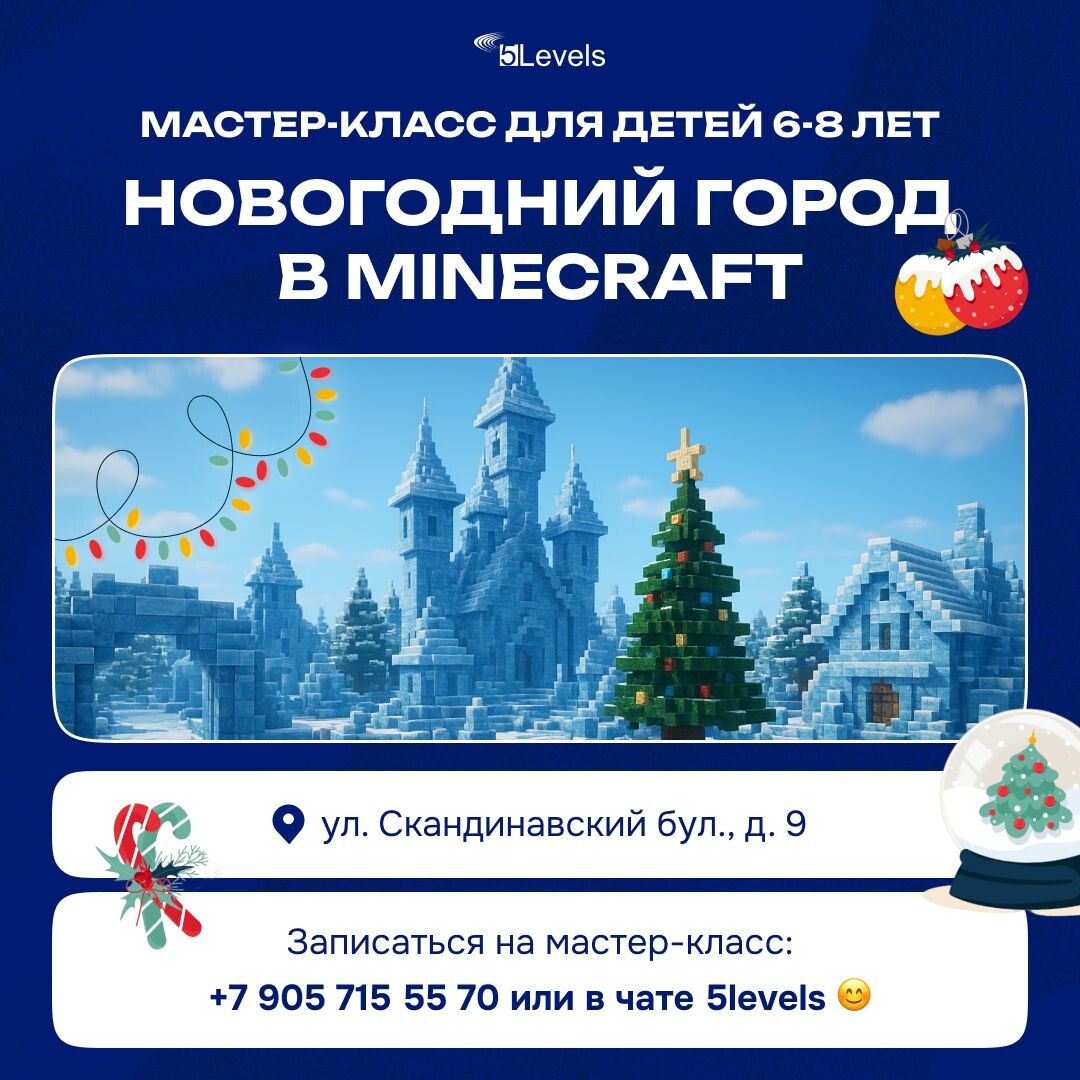 🎮 Новогодний город в Minecraft — короткий практический урок 20 декабря в 11:00 Minecraft может быть не только любимой игрой ребёнка, но и творческой мастерской. За 45 минут мастер-класса научим создавать собственный мир в Minecraft Education. Объясним понятно, на визуальных блоках и без сложных команд. На занятии ребёнок: 🔹 соберёт и украсит улицы мини-города, 🔹 познакомится с базовыми командами, повторами и системой координат, 🔹 протестирует и сохранит готовый мир. Каждый участник заберёт проект и скриншоты домой и сможет использовать собственные наработки в игре. 📍 Адрес: Скандинавский бул., д. 9 💸 Стоимость: 800 ₽ Такие мини-уроки — отличный старт для логического мышления. Ребёнок получит первые навыки программирования — полезно как для хобби, так и для будущих IT-профессий 🚀 📲 Запись на мастер-класс по телефону +79057155570 или в чате 5Levels