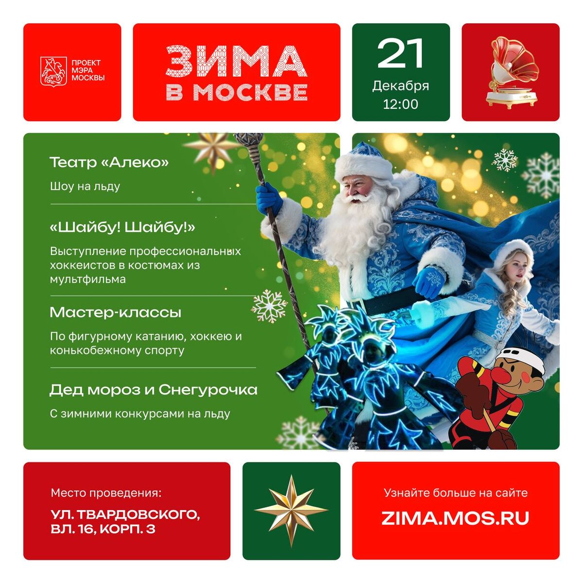 ❄️ Зима в Москве представляет! ❄️ ⛸️✨ Настоящее зимнее шоу на льду для всей семьи! 📍 Театр «Алеко» 🎭 Шоу на льду «Шайбу! Шайбу!» — выступление профессиональных хоккеистов в ярких костюмах из мультфильма 🏒🔥 🎓 Мастер-классы — фигурное катание ⛸️ — хоккей 🏒 — конькобежный спорт 🏁 🎅🤍 Дед Мороз и Снегурочка — зимние конкурсы и развлечения прямо на льду 🎄❄️ 🗓 Когда: 21 декабря ⏰ Время: 12:00 📌 Где: ул. Твардовского, вл. 16, корп. 3 Приходите за праздничным настроением и зимними эмоциями! ✨☃️ #ЗимаВМоскве #МоскваЗимой #АфишаМосква #КудаПойтиМосква #ЗимниеРазвлечения #СемейныйОтдых #ЛедовоеШоу #ДедМороз #ОКЦСЗАО 📱 Подписывайся на наш канал, чтобы не пропустить интересные мероприятия и мастер-классы в СЗАО!