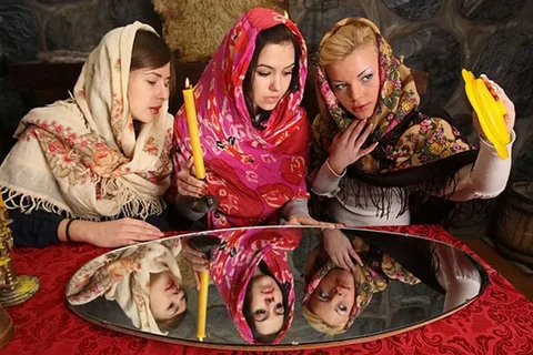 После зеркала девушки гадали с помощью воды и воска, трактуя каждую фигурку, образовывавшуюся с помощью воска на воде, по своему. Потом писали имена на бумажках, чтобы утром вытащить нужную, а еще много разговаривали, шутили и веселились. Под конец они решили погадать в последний раз - взять ботинок и бросить через забор. Куда упадет, в той стороне и будет жить жених.