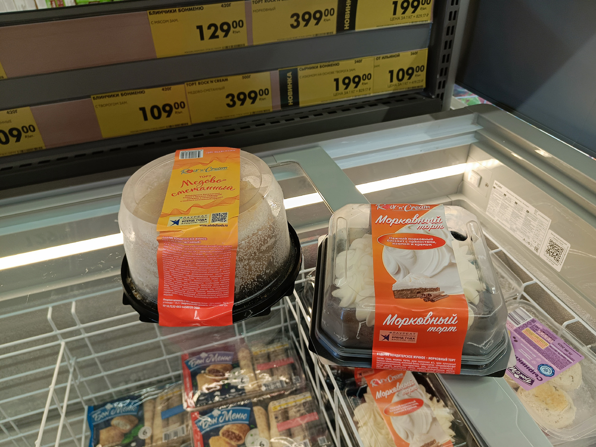 Пора пополнить холодильник, и я направилась в ближайший «Чижик». В последнее время эти магазины стали весьма популярны в нашем городе, и теперь их можно найти практически в каждом районе. Хоть я и не покупаю там всё, но некоторые товары действительно заслуживают внимания, а постоянные скидки делают этот магазин привлекательным для повторных визитов. В одном из холодильников сразу привлекают внимание два торта, из которых можно выбрать: "Морковный" и "Медово-сливочный". Оба торта массой 500 граммов по цене 399 рублей. По-моему, эти торты требуют более изысканного оформления. Сейчас они выглядят слишком просто и непримечательно, особенно «Морковный». Но, как говорится, на вкус и цвет товарищей нет. Охлаждённая куриная тушка цыплёнка бройлера с жирком, каждая около 1,6-1,8 кг. Я часто готовлю в духовке с картошкой или если родные просят, могу приготовить "цыплёнка табака". Цена 189 рублей за 1 кг. Мороженая говяжья печень, фасована по 1,2-1,5 кг. Цена 349 рублей за 1 кг. Самое главное даж