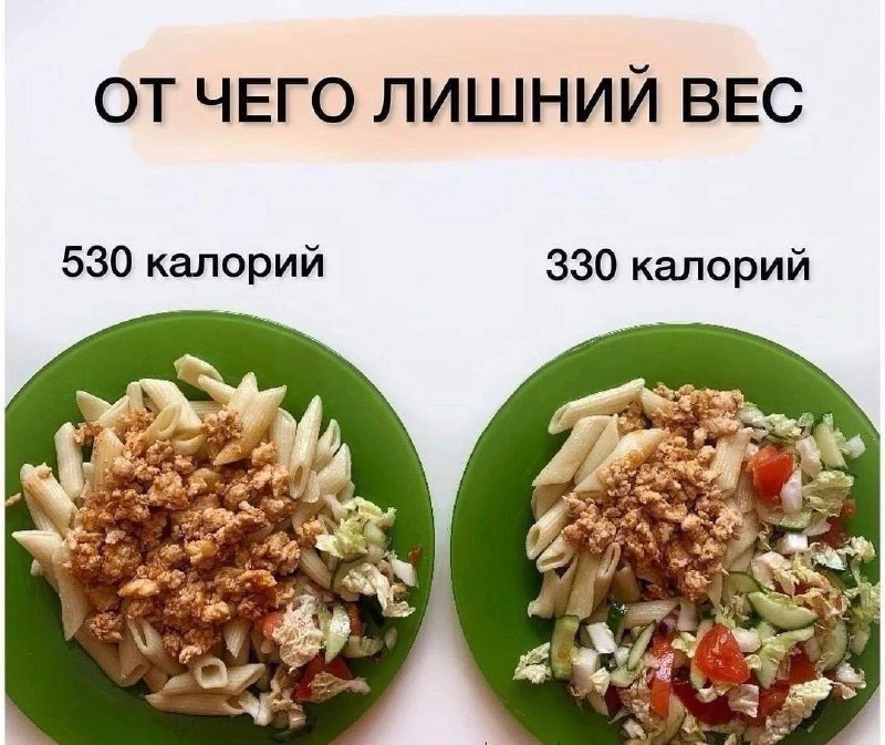 ✅ Почему мы набираем лишний вес? Дело не столько в том, что мы едим, а в том, сколько! 🚫 530 калорий и 330 калорий — почувствуйте разницу. Что в тарелках: ▫️ 60 г макарон, 150 г филе, 20 г томатной пасты, масло для жарки, 100 г салата с маслом = 530 ккал ▫️ 40 г макарон, 100 г филе, 10 г томатной пасты, без масла, 200 г салата с маслом = 330 ккал ❗️ Уменьшая порцию и меняя приготовление, вы делаете рацион легче, даже если объём кажется тем же. И не забывайте про пользу овощей! ▶️ Макароны, картофель, бананы и сладкое — могут входить в здоровое питание при правильном количестве. ▫️ Лучше сложные углеводы, но следите за грамотной порцией. ▫️ Заменив куриное филе на более жирные части, увеличите калории — учитывайте это! ▫️ Любая из этих тарелок допустима, главное — ваша суточная норма калорий.