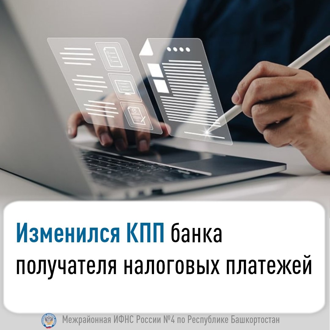 Изменился КПП банка получателя налоговых платежей С 05 декабря 2025 года изменился КПП банка получателя налоговых платежей на 770701001. Ранее в платежных поручениях указывался КПП 770801001. Для корректного перечисления налогов, сборов и других обязательных платежей в бюджетную систему Российской Федерации, администрируемых налоговыми органами, необходимо использовать следующие реквизиты: Получатель: Казначейство России (ФНС России) ИНН получателя:7727406020 КПП получателя: 770701001 Наименование банка получателя средств: ОКЦ 7 ГУ Банка России по ЦФО//УФК по Тульской области, г. Тула БИК банка получателя средств: 017003983 Номер счета банка получателя средств: 40102810445370000059 Номер казначейского счета: 03100643000000018500 Межрайонная инспекция ФНС России 4 по Республике Башкортостан Источник https://uchaly102.ru/?p=116368