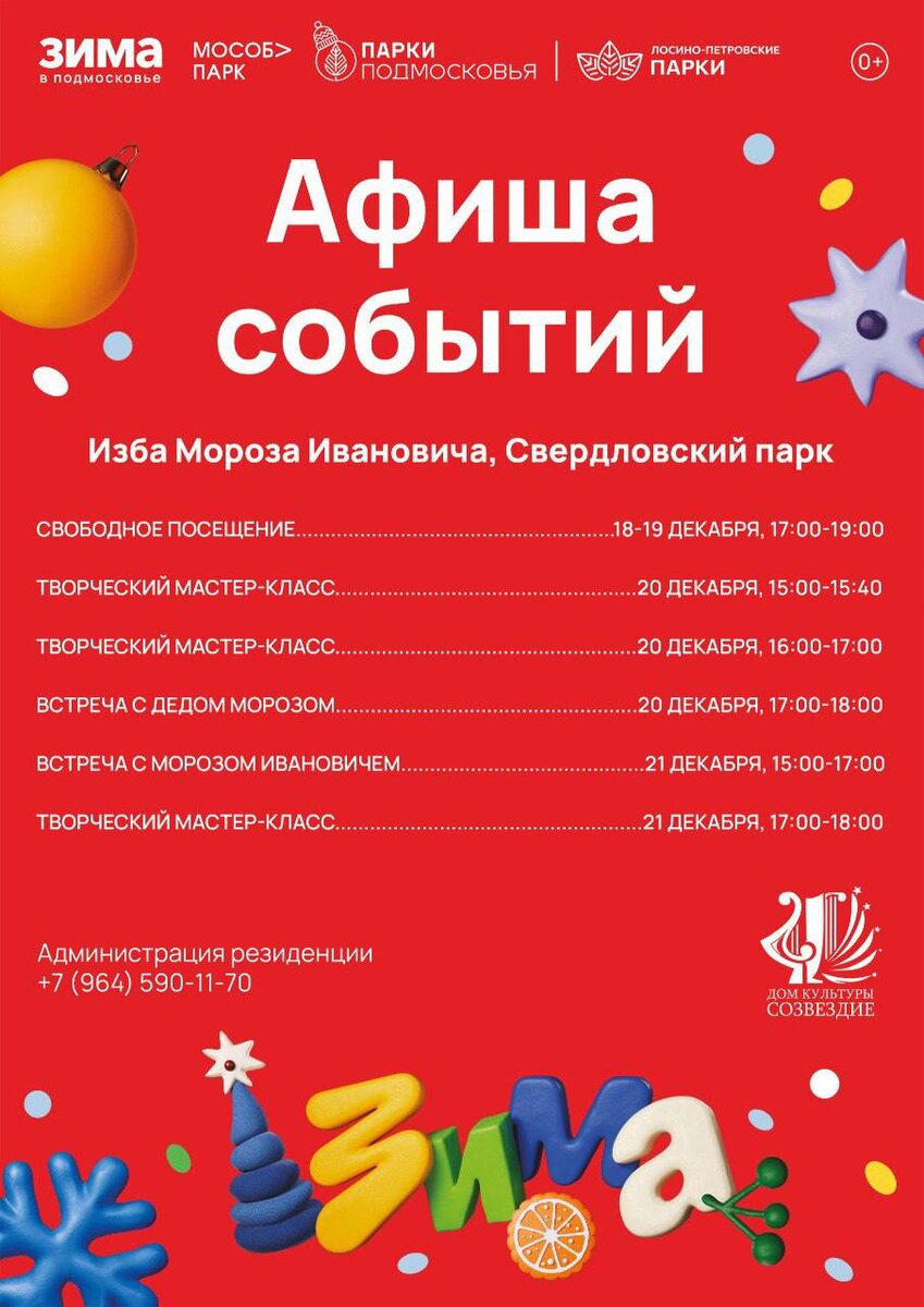 Парки Лосино-Петровского округа зовут на предпраздничные мероприятия ☃️ 🎄 В ближайшие выходные парки округа превратятся в центры семейного отдыха, спортивных достижений и зимнего волшебства. Программа насыщена событиями для гостей всех возрастов — от творческих мастерских и интерактивных викторин до спортивных турниров и встреч с главными героями зимы. 😉Особой локацией в эти дни станет Изба Мороза Ивановича в Свердловском парке. Для тех, кто хочет познакомиться с резиденцией заранее, 18 и 19 декабря с 17:00 до 19:00 открыто свободное посещение. 🤩 В субботу, 20 декабря, гостей избы ждет насыщенная творческая программа: в 15:40 начнется «Мастерская Рукодельницы», в 16:00 — мастер-класс по изготовлению елочек из пластилина от арт-студии «Василиса Прекрасная», а в 17:00 — параллельно встреча с Дедом Морозом и мастер-класс по написанию писем волшебнику. 👍В воскресенье, 21 декабря, с 15:00 до 17:00 можно будет пообщаться с самим хозяином резиденции — Морозом Ивановичем, а в 17:00 со