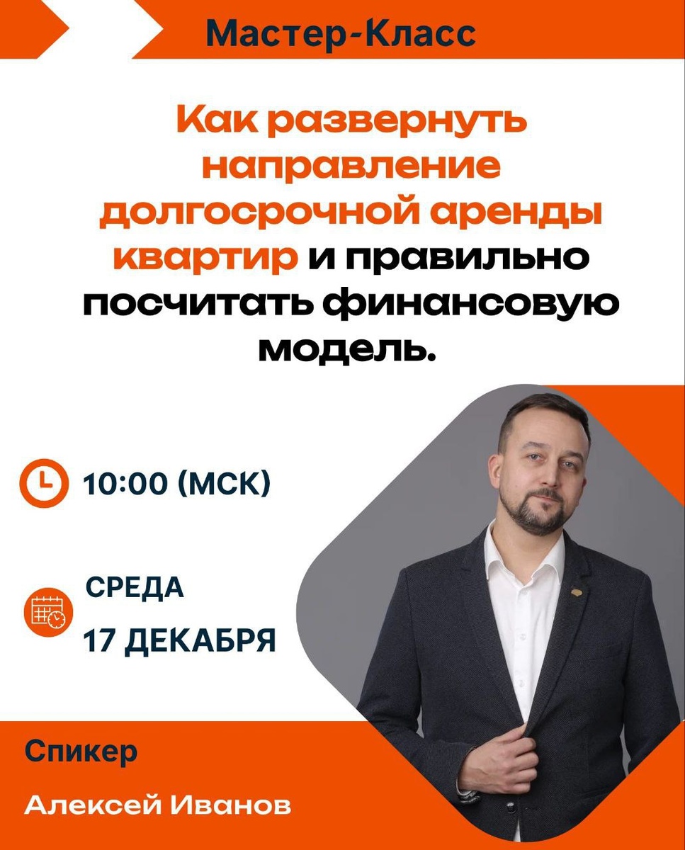 Конец года — странное время. Ты вроде уже понимаешь, что дальше так же — не хочешь. Но и резких движений делать не тянет. В посуточной аренде это особенно чувствуется: ты уже вырос, разобрался, многое работает, и одновременно появляется вопрос: а какой следующий шаг вообще логичен? Не «больше объектов любой ценой», а рост, который не съедает внимание, время и нервы. 📅 17 декабря в 10:00 (МСК) в Клубе посуточников пройдет живой эфир с Алексеем Ивановым — основателем Клуба посуточников и компании «Надо!Снять» (75 квартир в долгосрочной аренде). 📝 Тема эфира: Как развернуть направление долгосрочной аренды квартир и правильно посчитать финансовую модель Это разговор не про теорию и не про «попробуйте вот так». А про реальные решения, которые принимаются, когда посутка перестаёт быть единственным вариантом роста. На эфире Алексей разберёт: — как и почему можно делать выбор в сторону долгосрочной аренды — какая модель выдерживает нагрузку и сходится в цифрах — как стартовать без разд