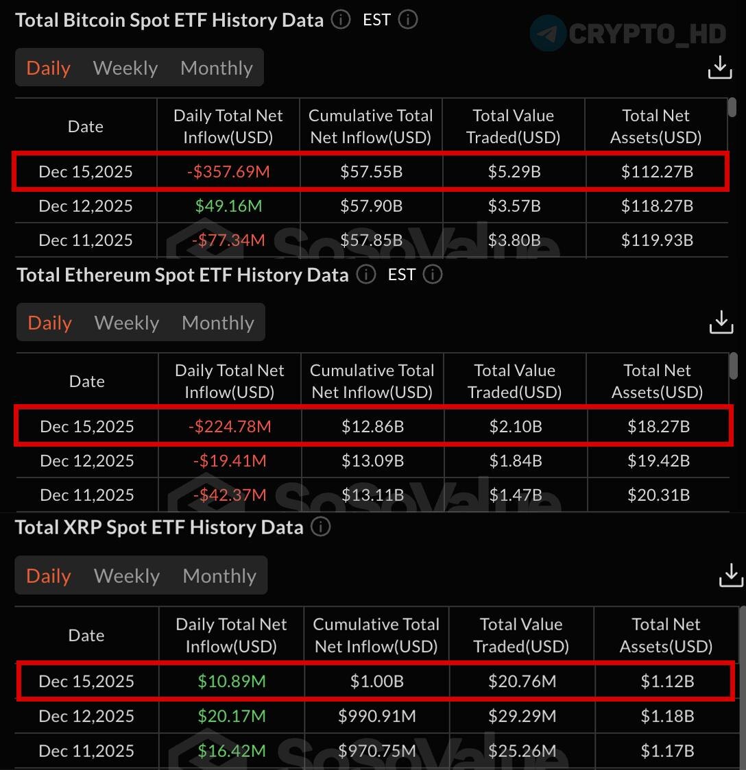 🤔 SV: Финпотоки крипто-ETF за вчерашний день. ▫️#BTC = -$357,690,000. ▫️#ETH = -$224,780,000. ▫️#SOL = +$35,200,000. ▫️#XRP = +$10,890,000 (21 зеленый день подряд). ▫️#LINK = +$2,020,000. ▫️#LTC, #HBAR, #DOGE = нет данных или $0. Crypto Headlines