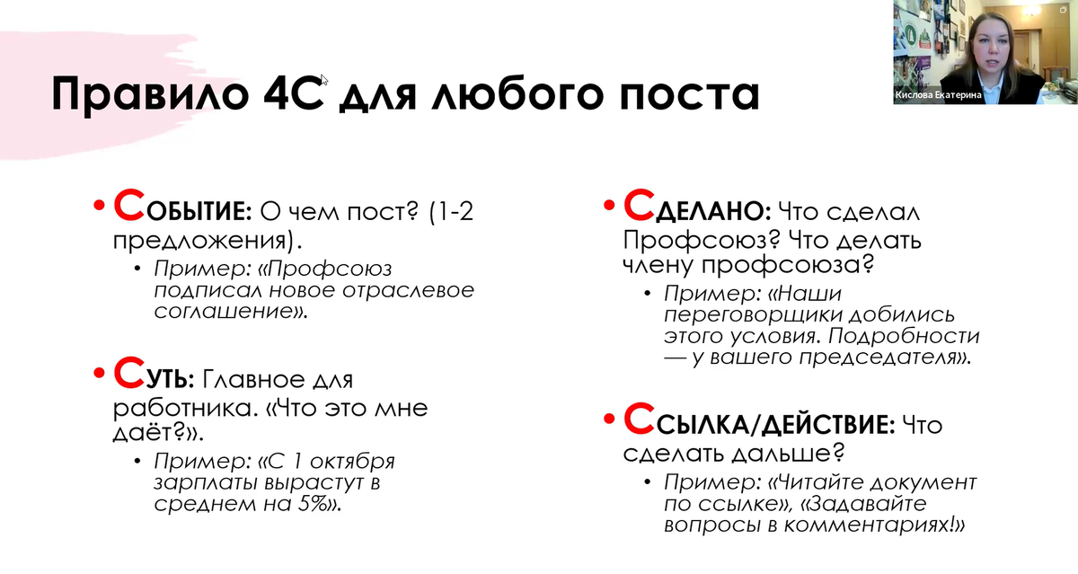 16 декабря 2024 года Центральный комитет Рослеспрофсоюза провел практический онлайн-семинар «РОСЛЕСПРОФСОЮЗ: грамотно рассказываем о нашей работе». Мероприятие собрало живую и вовлеченную аудиторию — десятки профсоюзных активистов, которые в течение полутора часов активно изучали инструменты современной коммуникации. Несмотря на технические сложности, с которыми в отдельных случаях сталкиваются при онлайн-подключении, на связь вышли самые заинтересованные представители из более чем 30 субъектов РФ. Спикер — Кислова Екатерина Жановна, ведущий специалист по организационно-профсоюзной и информационной работе, автор Курса Солидарности для профактива, — дала участникам четкие практические алгоритмы: Создание понятного и полезного контента для соцсетей. Юридические основы безопасного ведения сообществ. Эффективное взаимодействие с местными СМИ. Использование возможностей мониторинга ЦУР для защиты прав работников. Широкая география подключений наглядно показала об