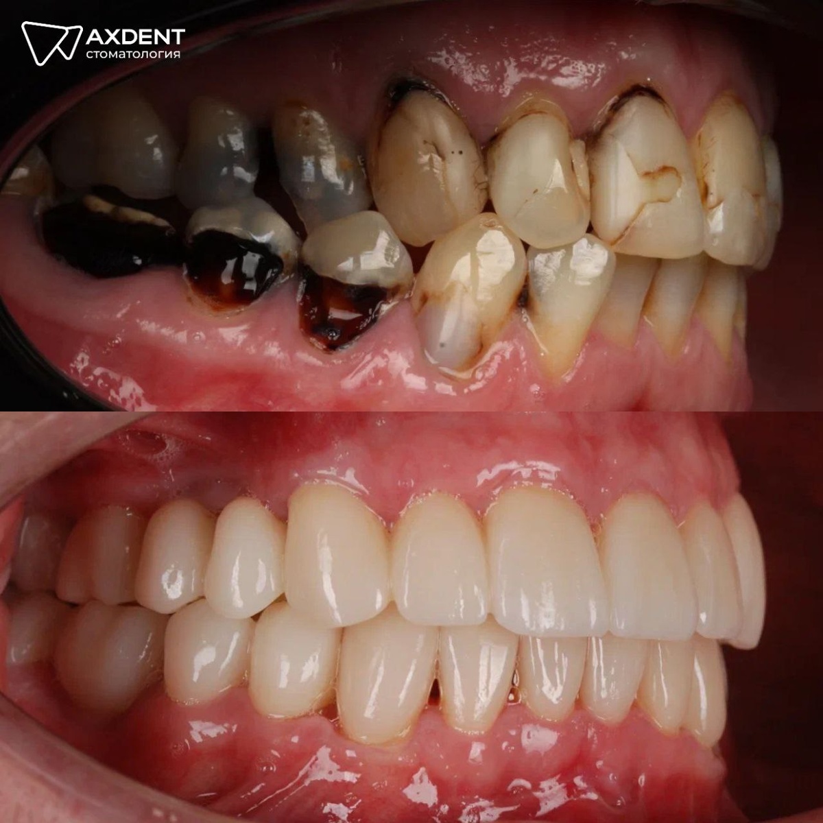 Печальный факт. Когда к нам обращаются пациенты с сильно измученными зубами, это вообще не значит, что они настроены решительно, готовы работать над улыбкой до победного и не приемлют компромиссов. А этот человек попёр как ледокол. Ничего кроме уважения и радости от того, что еще один пациент познал кайф от красивой здоровой улыбки, эта история у меня не вызывает. Приступили к трансформациям мы в марте 24-го года и за 1,5 года получили такой результат. Принялись за удаление. Всего 8 зубов покинули рот и других вариантов тут быть не могло. Пролечили гору зубов и, я полагаю, объяснения не нужна, почему гору. Уже в июне пациент смог отправиться на ортодонтическое лечение с полностью санированной полостью рта. Когда ортодонт увидел, что место под импланты свободно, мы перешли к имплантации. Я уже говорил ранее, что нет необходимости ставить импланты только после снятия брекетов. Главное - привести зубные ряды в состояние, при котором уже есть возможность имплантироваться. Такой подход