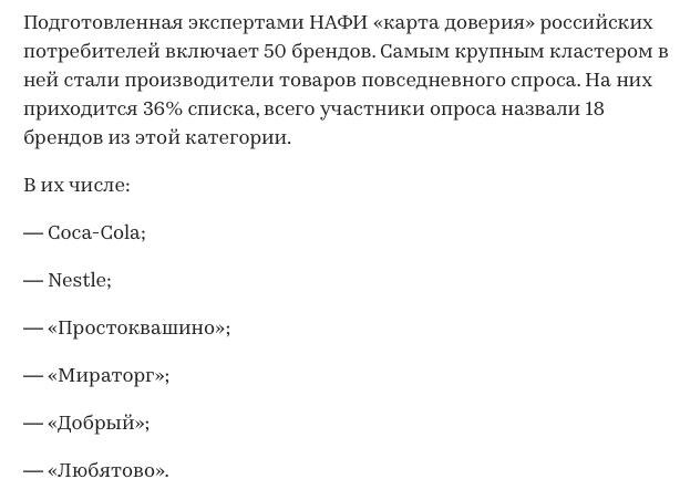 Первые места в списке любимых у россиян брендов, согласно опросу НАФИ, заняли Samsung, «Яндекс», «Сбер», Ozon и Adidas Самым крупным кластером «карты доверия» стали повседневные товары Наибольшим доверием и любовью у жителей российских городов пользуются производители товаров повседневного спроса, цифровые и технологические компании, а также розничные сети и производители автомобилей, следует из пилотного исследования аналитического центра НАФИ, подготовленного при поддержке Ассоциации коммуникационных агентств России (АКАР) Telegram | Дзен | MAX