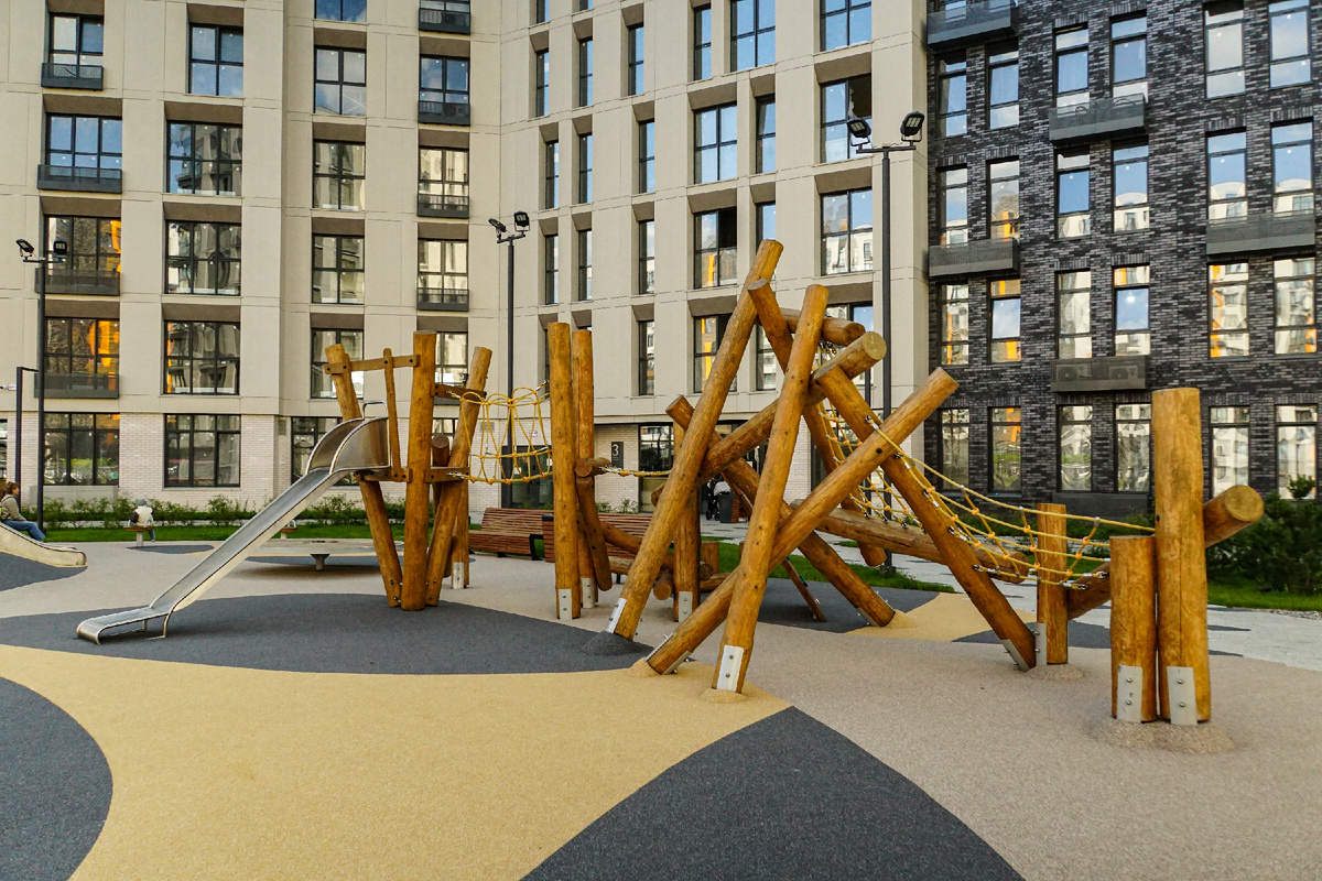 Горожане все чаще выбирают дворы с зеленью и природными материалами, а не с ярким пластиком. Этот запрос поддерживает и государство: по программе «Комфортная среда» с 2017 года в России благоустроили свыше 90 тыс. парков, скверов и дворов, где важную роль играют детские зоны. Во многих проектах используют дерево, камень, песок, живые растения. Эко-дизайн — это проектирование с опорой на природу и безопасные материалы. Задача — сократить вред для среды и сделать пространство комфортным для людей. Для детских площадок это означает отказ от кричащего пластика в пользу натуральных компонентов: бревна и пни, канаты, песок, щепа, холмы из грунта. Ребенок играет как бы «в лесу», хотя находится во дворе. Дерево.