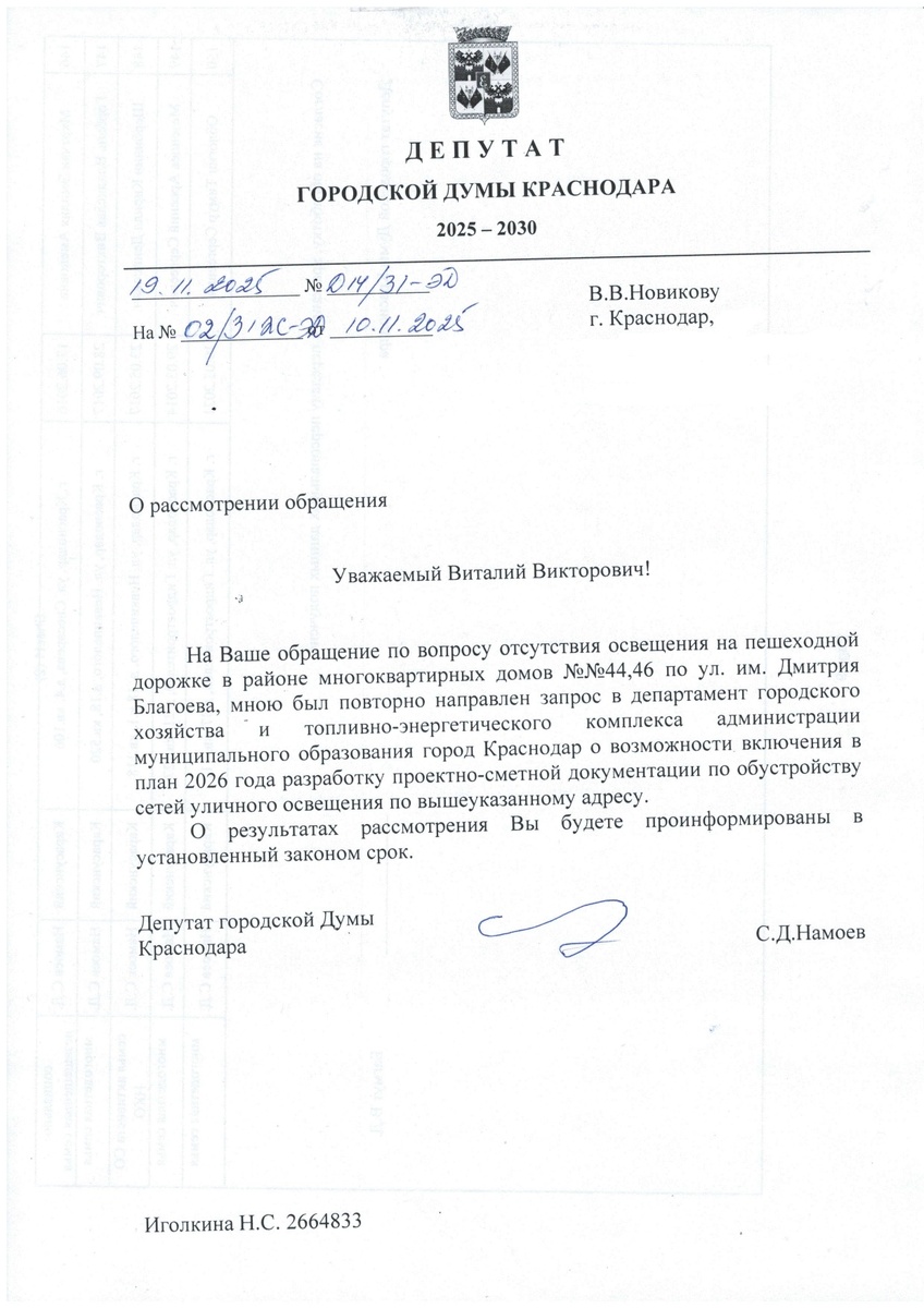 Уличное освещение на пешеходной дорожке, рядом с Невкипеловским рынком на Гидрострое в г. Краснодаре (в районе домов по ул. Благоева, 50, 44, 46) будет ли? Напомню, по вопросу проектирования и строительства на указанном тротуаре, который имеет ОЧЕНЬ большую проходимость, освещения, я уже дважды писал заявления депутату городской Думы Краснодара Намоеву Сергею Джемаловичу. О его ответе на первое мое заявления, я уже писал, с приложением текста ответа. На второй запрос, Намоев С.Д. прислал мне письмо от 19.11.25 г. в котором сообщил, что повторно направили запрос в ДГХиТЭК АМОГК о возможности включения в план на 2026 г. разработку проектно-сметной документации на указанные работы. При этом, Намоев С.Д. сообщил, что о результатах рассмотрения я буду проинформирован. Так, 09.12.25 г. мне поступил ответ из Департамента городского хозяйства г. Краснодара о том, что денег на указанные работы нет, но вопрос строительства освещения на указанном тротуаре ВОЗМОЖНО будет рассмотреть в 2026 г., в случае выделения бюджетных средств. Но ни ДГХ, ни Намоев С.Д. так и не сообщили - а что сделано, чтоб денежные средства был выделены на указанные работы? Поданы ли департаментом городского хозяйства или Намоевым С.Д. соответствующие заявки, запросы на выделение бюджетных средств, включены ли соответствующие работы в планы и реестры работ на 2026 г. и т.п.? На указанные вопросы я ответ не получил. Направил и в ДГХиТЭК и Намоеву С.Д. дополнительные запросы (уже третьи по указанному вопросу). Работа считается завершенной, только когда достигнут результат, а не когда "возможно", "если выделят" и т.д. и т.п. "Возможно", "если выделят" не интересует. Нужен четкий ответ!