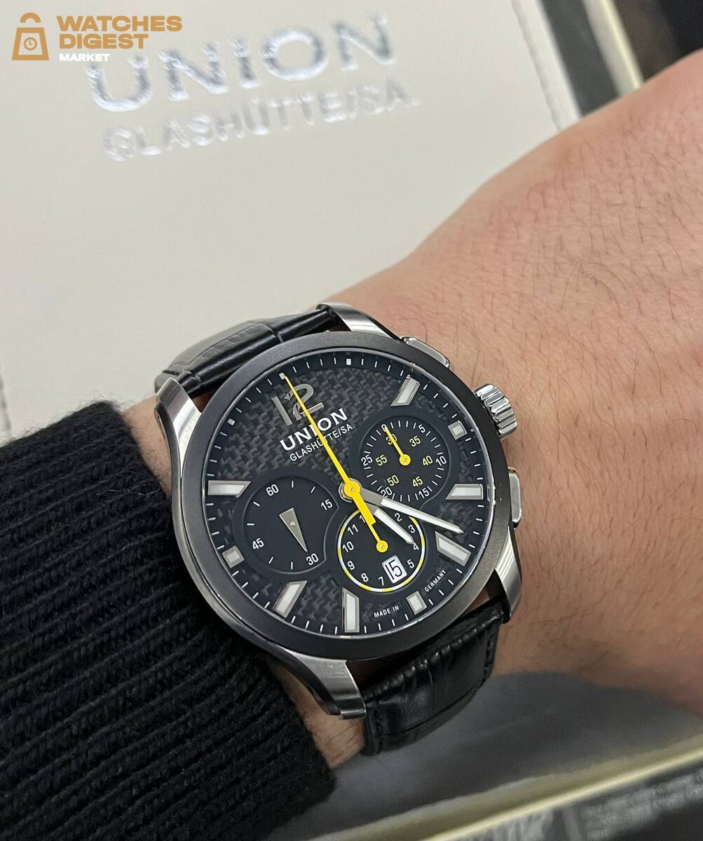 UNION GLASHÜTTE BELISAR CHRONOGRAPH: НЕМЕЦКАЯ ТОЧНОСТЬ В СПОРТИВНОМ ФОРМАТЕ #обзор_WD Union Glashütte Belisar Chronograph — это современный спортивный хронограф с чётким инженерным характером и ярко выраженными корнями немецкой часовой школы. Модель ориентирована на активное использование, сохраняя при этом сдержанную эстетику и высокое качество исполнения. Дизайн и материалы Корпус диаметром 43 мм и толщиной 14 мм выполнен из нержавеющей стали. Пропорции подчёркивают инструментальную направленность часов, при этом вес 130 граммов остаётся комфортным для ежедневного ношения. Чёрный PVD-безель добавляет контраста и визуальной глубины, усиливая спортивный характер модели. Циферблат выполнен из карбона — материал не только эффектный, но и прочный. Его текстура подчёркивает технологичность часов. Контрастные стрелки и метки с люминесцентным покрытием обеспечивают отличную читаемость. Сапфировое стекло с антибликовым покрытием эффективно устраняет отражения при любом освещении. Задняя