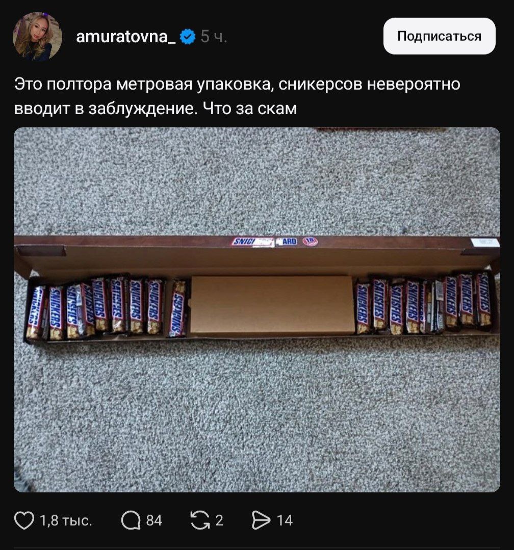Девушку ЗАСКАМИЛИ набором Сникерсов — она купила полутораметровую пачку, а внутри коробки обнаружила... только 2/3 вкусняшек. Шринкфляция добралась до святого. CtrlAltDelights- подписаться