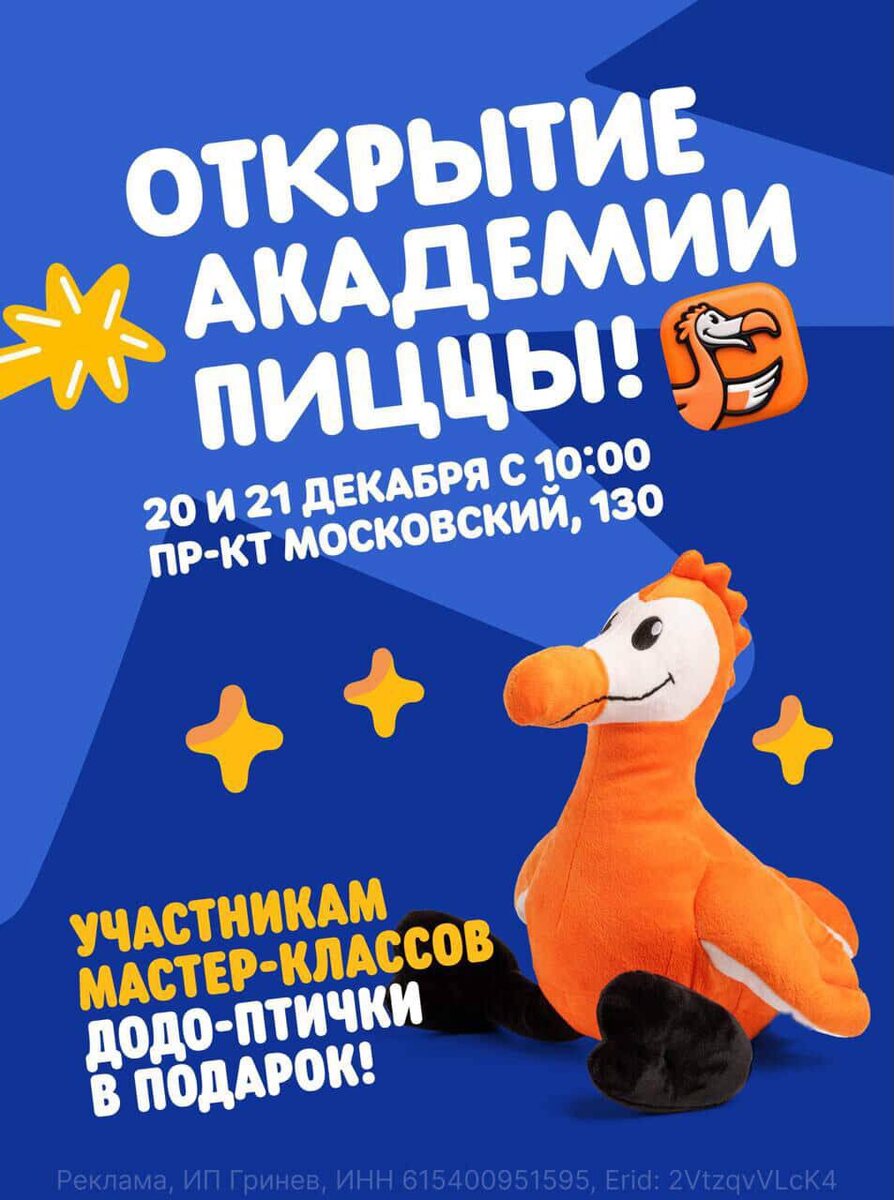 20 декабря с 10:00 Додо будет ждать вас на празднике Академии Пиццы — нового пространства, где сбываются мечты не только детей, но и взрослых! В Академии Пиццы можно приготовить настоящую пиццу, повеселиться и получить море новых эмоций! Вас будет ждать: ✨ целый день мастер-классов ✨ увлекательная развлекательная программа ✨ розыгрыши и подарки А еще все, кто посетит мастер-классы 20 и 21 декабря, получат игрушку Додо-птичку в подарок! 🎁 📍 Ждём вас по адресу: проспект Московский, 130 📎 Записаться на мастер-класс можно по ссылке — dodopizzakids.ru Поторопись, количество мест ограничено!