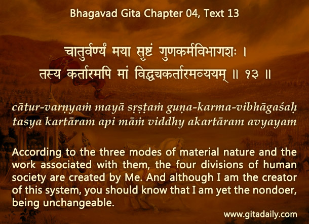 Разделив людей по их качествам (гуне) и роду занятий (карме), Я создал общество, состоящее из четырёх варн (брахманов, кшатрий, вайший и шудр). Хотя Я и являюсь создателем этой системы, знай, что Сам Я неизменен, не совершаю действий (акарта) и не побуждаю к действию других.
