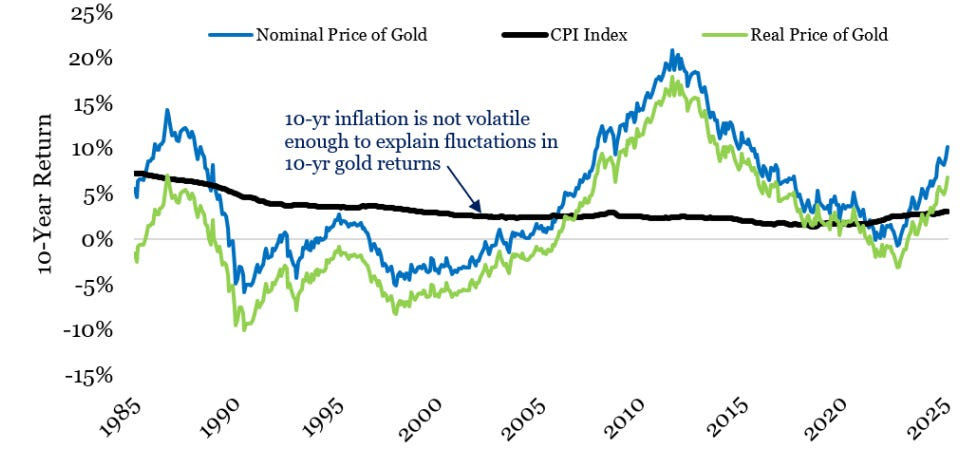 Да, для золота этот год выдался фантастическим. Он начался с отметки в 2625$ за унцию, а уже 08.10 цена впервые превысила 4000$. Это более чем 50% прибыли за 9 месяцев. Инвесторы снова стали жадными по металлу, и в течение 2025 г. было много сообщений о буме цен на золото и о том, что им двигало. Конечно же, инвесторы снова начали говорить о больших цифрах. Как и в 2011 г., когда наблюдался последний подобный рост цен на золото, Клод Эрб и Кэмпбелл Харви предупреждают инвесторов, что им не следует чрезмерно увлекаться. В своей новой статье Эрб и Харви, по сути, приводят те же аргументы, что и более десяти лет назад. Во-первых, они показывают, что золото является плохим средством защиты от инфляции. В очень долгосрочной перспективе (хотя это может означать очень долгое время) золото смогло не отставать от общего роста цен. Тем не менее, даже в течение инвестиционных периодов, длящихся десятилетие и более, золото часто не справлялось с защитой от инфляции. Это полностью опровергает нынеш