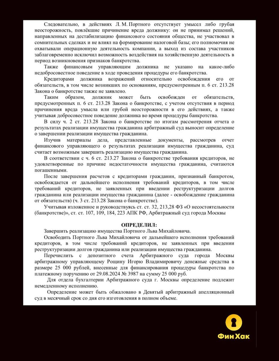 ! Официально! Фиксируем итог работы наших юристов и судебный прецедент! Напоминаем, что ранее субсидиарная ответственность не списывалась даже в рамках процедуры банкротства. Изначально суд привлек нашего клиента солидарно с другими соответчиками к субсидиарной ответственности в размере 36 757 586 рублей . В защите был использован комментарий Верховного суда к летнему обзору судебной практики. Писали об этом здесь. На основе приведенных нашими юристами доводов, клиент освобожден от субсидиарной ответственности. Дело вели юристы Дмитрий Стекольников и Виталий Аверин. Принимаем поздравления! Если у вас есть задачи для наших юристов, пишите @FinhackService