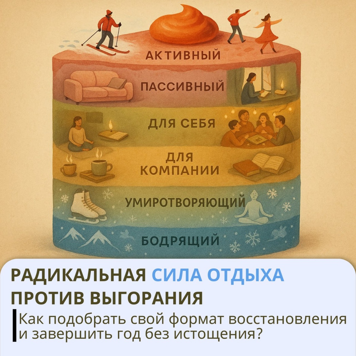 Конец года - время, когда тело и психика буквально требуют «перезагрузки». И дело не только в усталости, а в том, что нервная система нуждается в смене ритма. Психологи называют это ресторативным периодом - временем, когда нужно не «успеть», а восстановить себя. Каждый тип отдыха по-разному воздействует на эмоциональное состояние. Выберите тот, который откликается именно вам (разверните, чтобы увидеть весь список💙): 1️⃣ БОДРЯЩИЙ (нижний слой - фундаментальный, активизирующий) Примеры: прогулка на морозном воздухе, контрастный душ, купание в проруби, катание на коньках. Воздействие: активирует дофаминовую систему мозга, улучшает кровоток, повышает уровень энергии и снижает тревожность. Зачем: помогает вернуть телесное ощущение жизни после долгих нагрузок и сидячего образа жизни. 2️⃣ УМИРОТВОРЯЮЩИЙ (второй слой - балансирующий) Примеры: йога, дыхательные практики, чтение у камина, медитация, тёплая ванна. Воздействие: снижает уровень кортизола, активирует парасимпатическую нервную сис