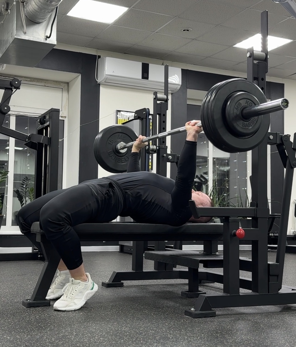 - Закрепите опору: Ноги плотно упираются в пол, таз прижат к скамье. Представьте, что вы пытаетесь оттолкнуть от себя пол — это напряжение передастся на гриф.